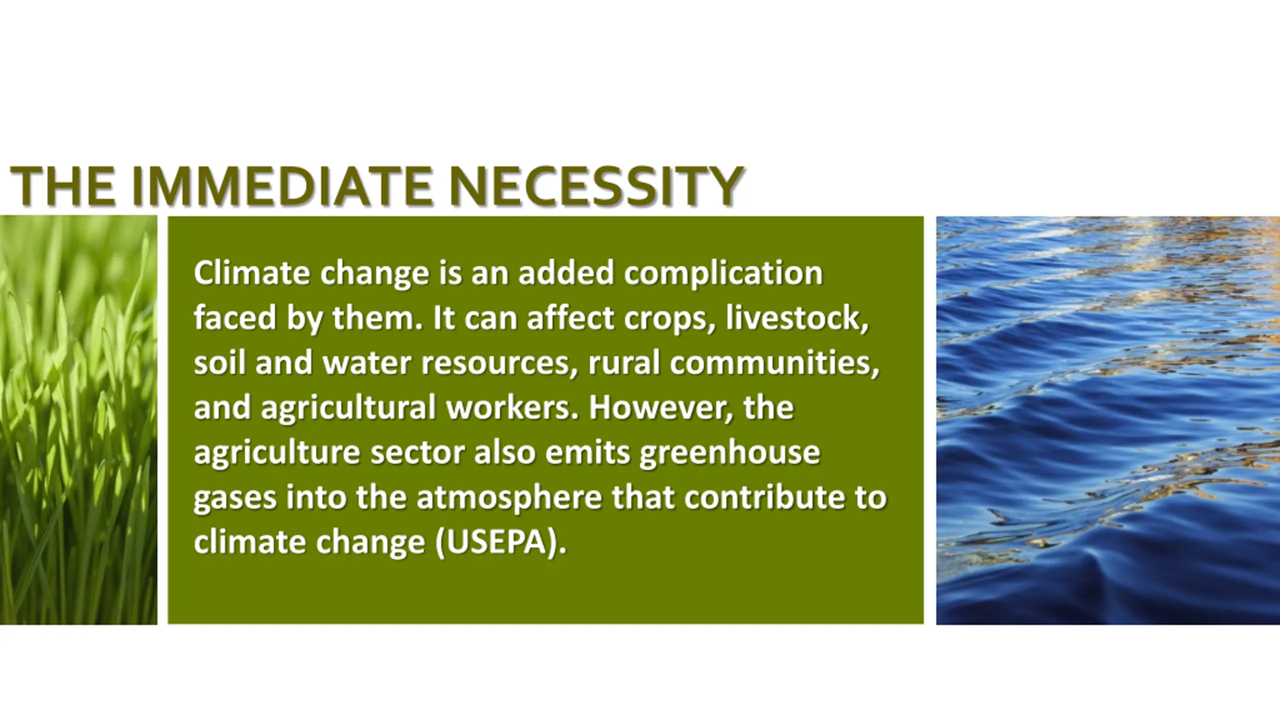 THE IMMEDIATE NECESSITY Climate change is an added complication faced by them. It can affect crops, livestock, soil and water resources, rural communities, and agricultural workers. However, the agriculture sector also emits greenhouse gases into the atmosphere that contribute to climate change (USEPA).