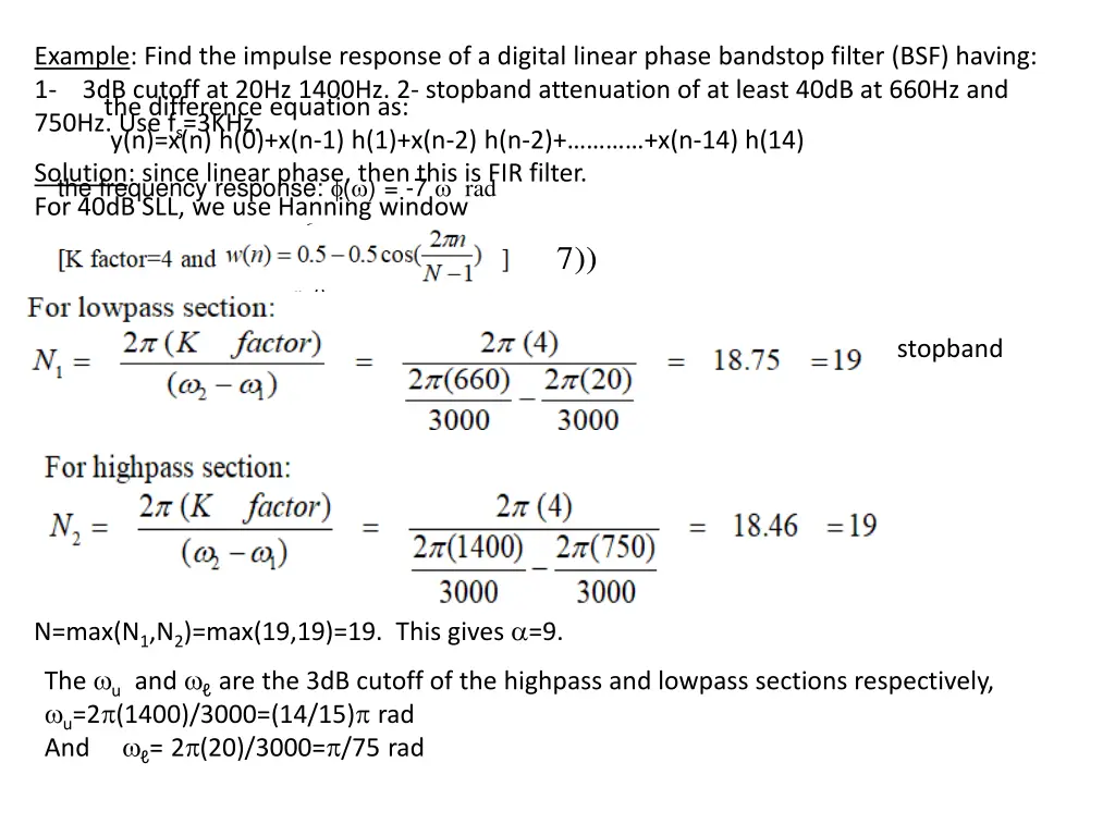 Example: Find the impulse response of a digital linear phase bandstop filter (BSF) having: 1- 3dB cutoff at 20Hz 1400Hz. 2- stopband attenuation of at least 40dB at 660Hz and 750Hz. Use fs=3KHz. the difference equation as: y(n)=x(n) h(0)+x(n-1) h(1)+x(n-2) h(n-2)+ +x(n-14) h(14) Solution: since linear phase, then this is FIR filter. For 40dB SLL, we use Hanning window the frequency response: ( ) = -7 rad 6 = n = + | ( | ) . 0 15 2 ( ) cos( ( 7 )) H h n n 0 H.W: Repeat previous example for a HPF with 3dB cutoff at 0.7 rad and stopband attenuation of at least 50dB at 0.2 rad. N=max(N1,N2)=max(19,19)=19. This gives =9. The u and are the 3dB cutoff of the highpass and lowpass sections respectively, u=2 (1400)/3000=(14/15) rad And = 2 (20)/3000= /75 rad