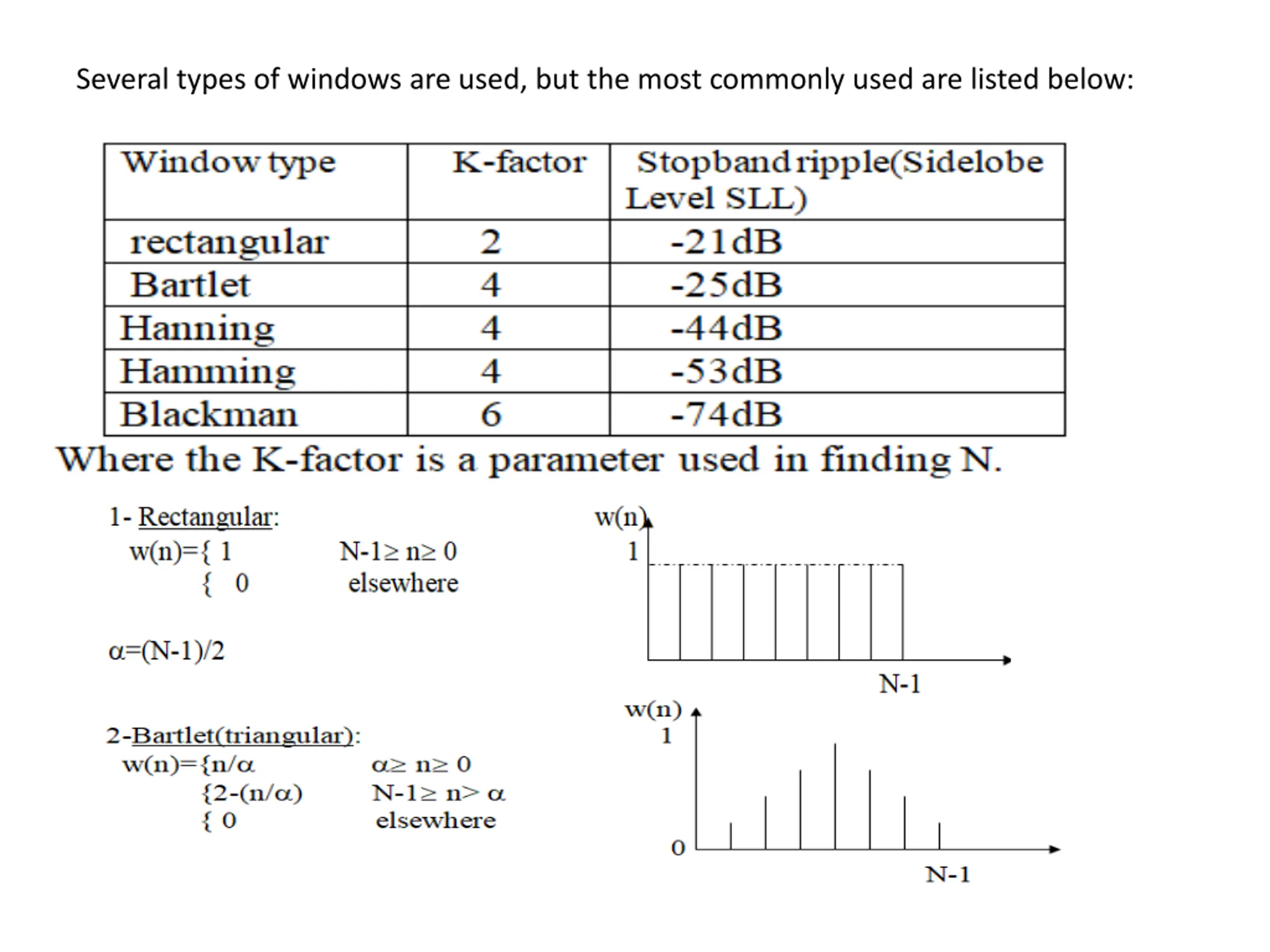 1) Compute N: we discuss how to find N: usually, N gives filter roll of ( how fast is the transition from passband to stopband or how is the obtained response is closed to ideal response). In general: where k1 and k2 are gain values at 1 and 2 and k1 is the -3dB level and k2 is usually taken as the maximum SLL 2) Now to find the overall impulse response h(n) with windowing , then: h(n) = hd(n) w(n) where hd(n) depends on filter type (LFP,HPF,BPF,BSF..) and w(n) is usually chosen according to the required sidelobe level (SLL)at stopband