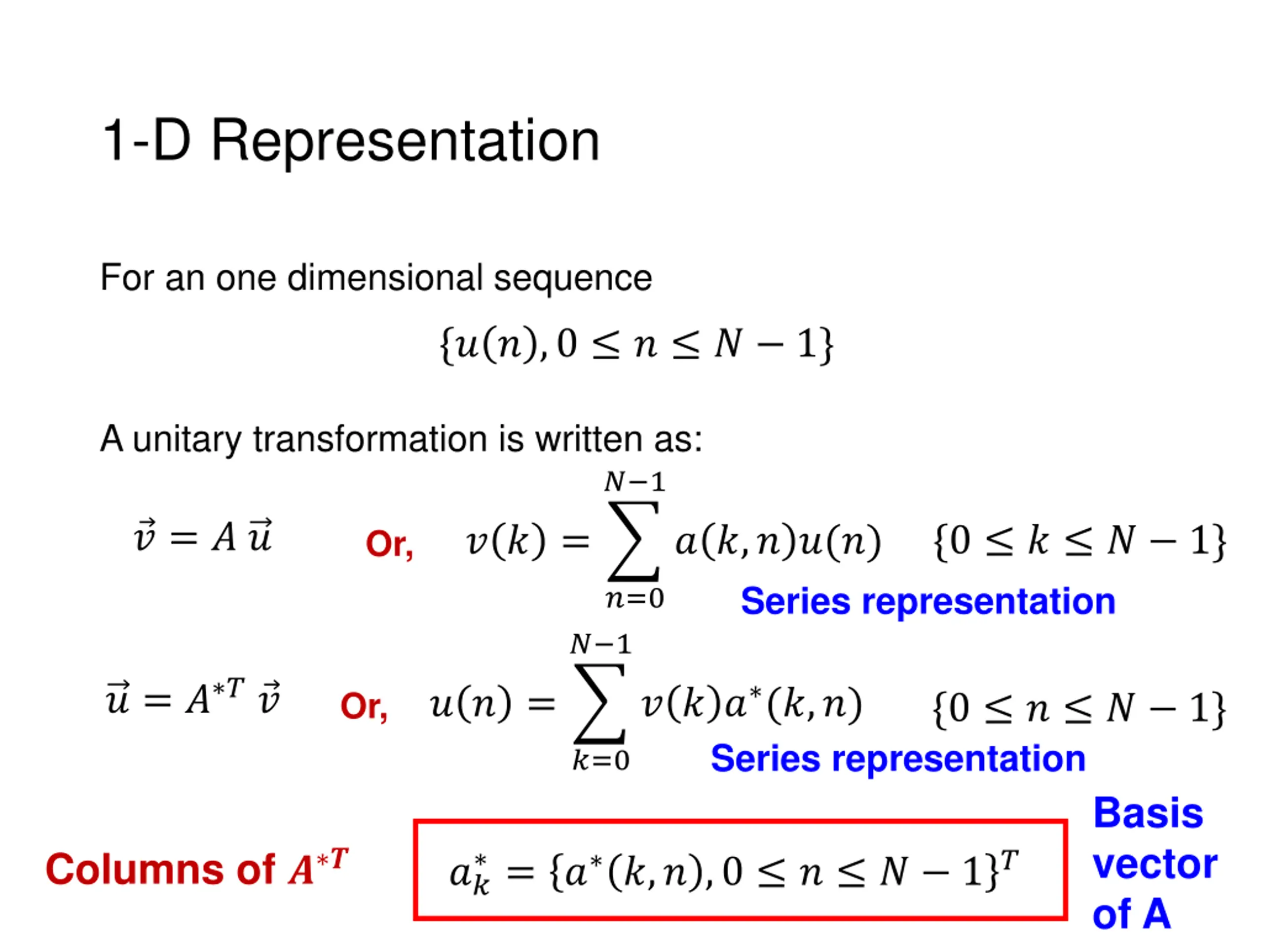 1-D Representation For an one dimensional sequence {? ? ,0 ? ? 1} A unitary transformation is written as: ? 1 ? = ? ? {0 ? ? 1} ? ? = ? ?,? ?(?) Series representation Or, ?=0 ? 1 ? = ? ? ? ? ? ? (?,?) Series representation ? ? = Or, {0 ? ? 1} ?=0 Basis vector of A Columns of ? ? = ? ?,? ,0 ? ? 1? ??