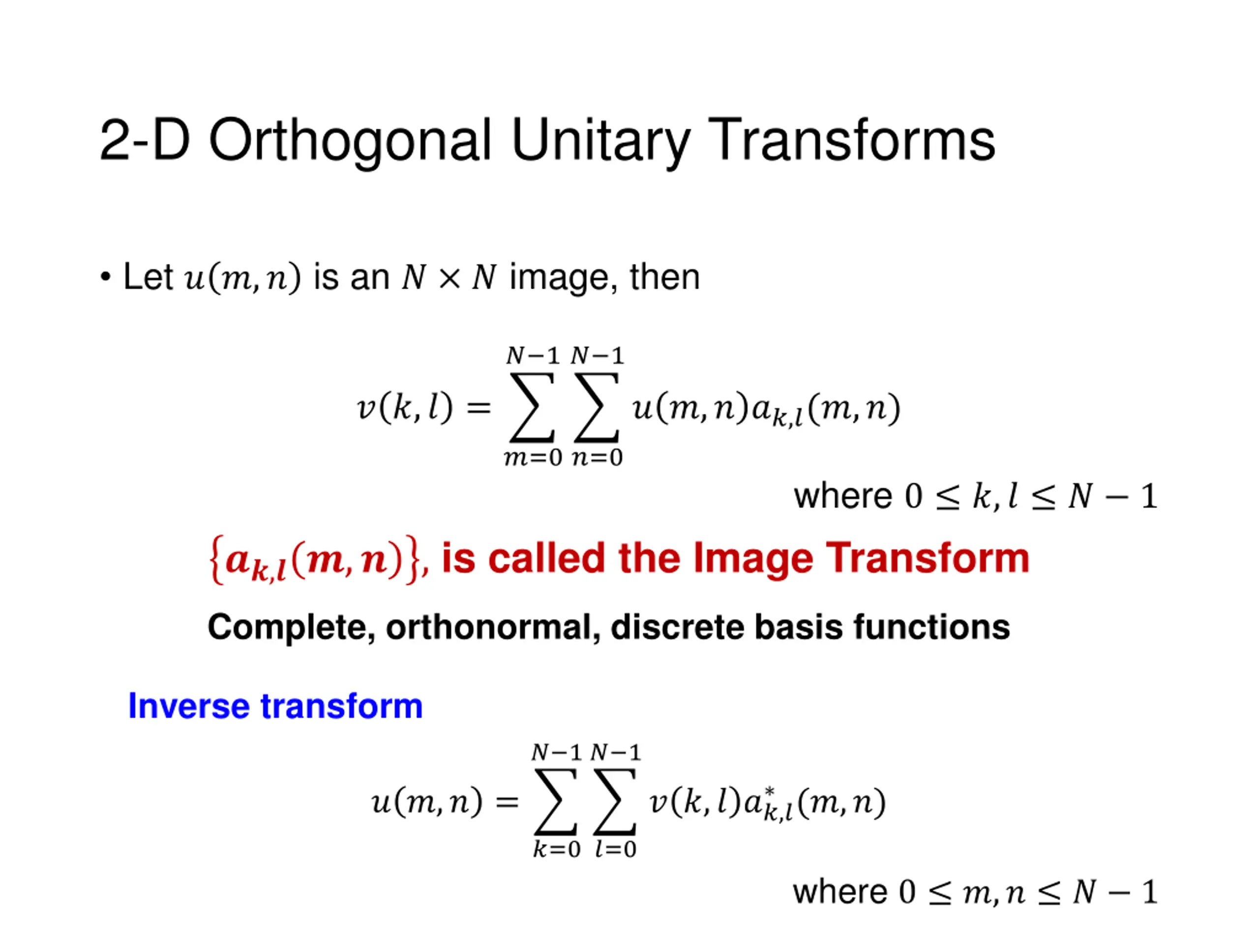 2-D Orthogonal Unitary Transforms Let ? ?,? is an ? ? image, then ? 1 ? 1 ? ?,? = ? ?,? ??,?(?,?) ?=0 ?=0 where 0 ?,? ? 1 ??,??,? , is called the Image Transform Complete, orthonormal, discrete basis functions Inverse transform ? 1 ? 1 (?,?) ? ?,? = ? ?,? ??,? ?=0 ?=0 where 0 ?,? ? 1