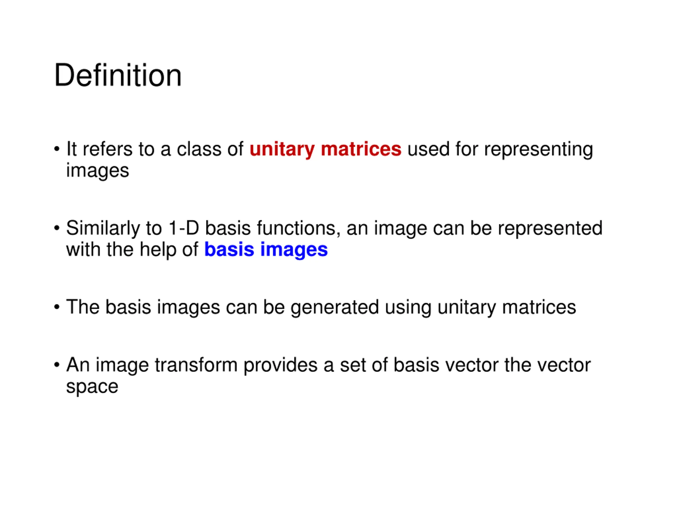 Definition It refers to a class of unitary matrices used for representing images Similarly to 1-D basis functions, an image can be represented with the help of basis images The basis images can be generated using unitary matrices An image transform provides a set of basis vector the vector space