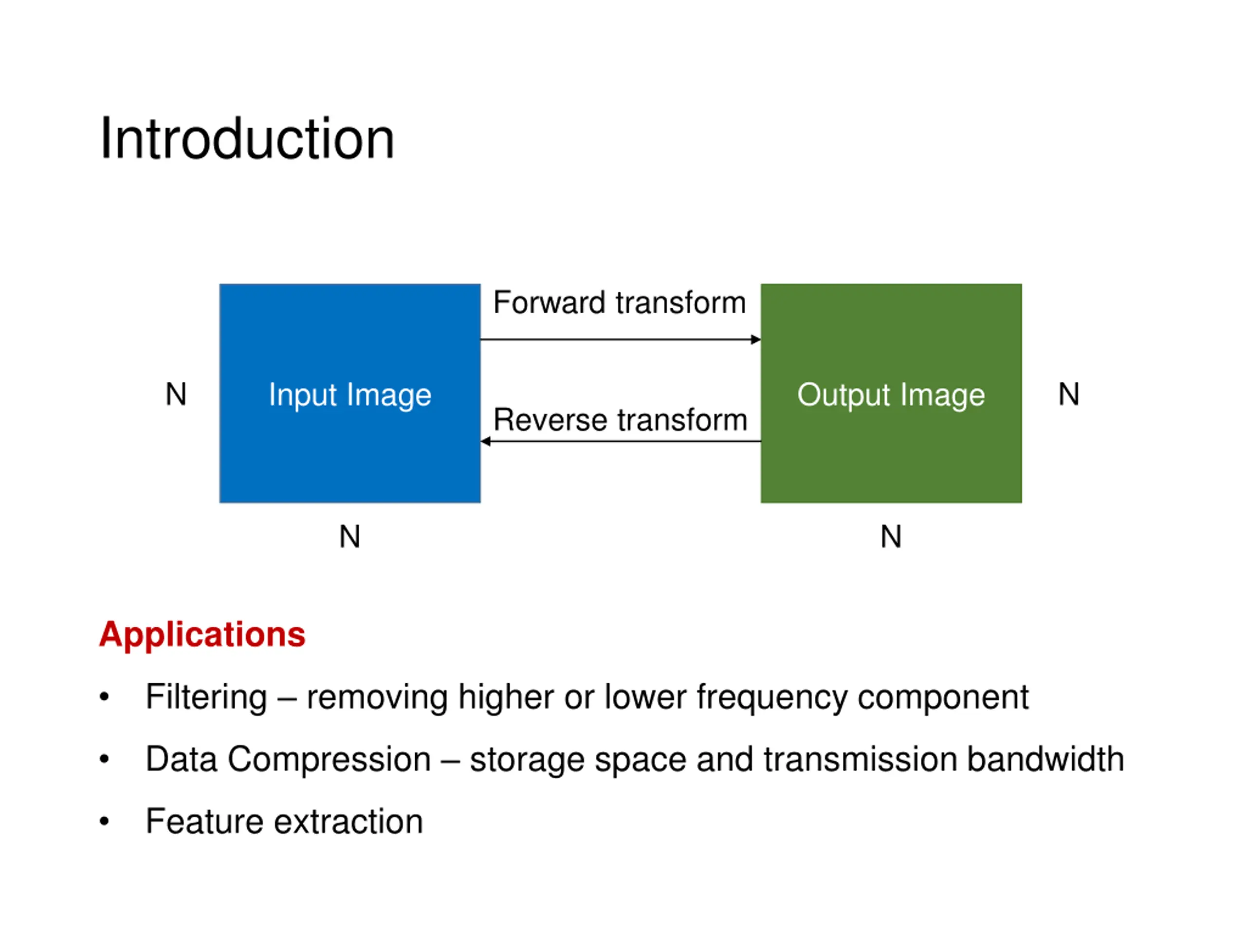 Introduction Forward transform N N Input Image Output Image Reverse transform N N Applications Filtering removing higher or lower frequency component Data Compression storage space and transmission bandwidth Feature extraction