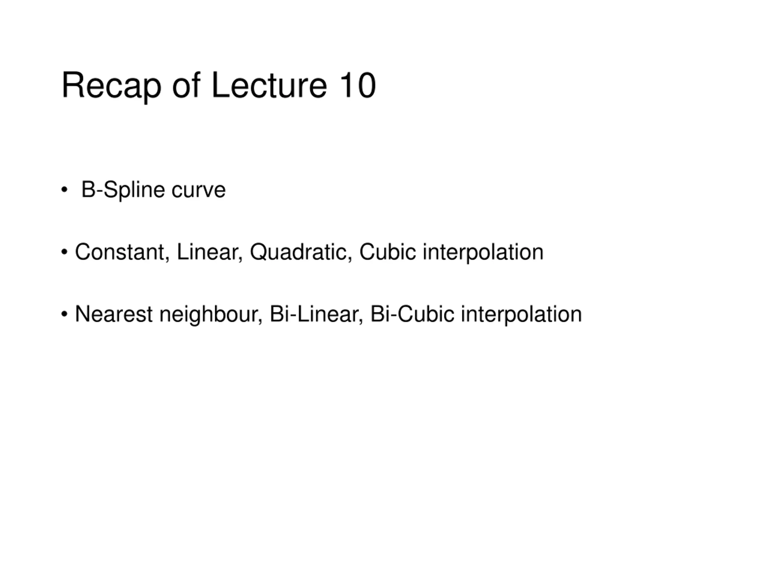 Recap of Lecture 10 B-Spline curve Constant, Linear, Quadratic, Cubic interpolation Nearest neighbour, Bi-Linear, Bi-Cubic interpolation