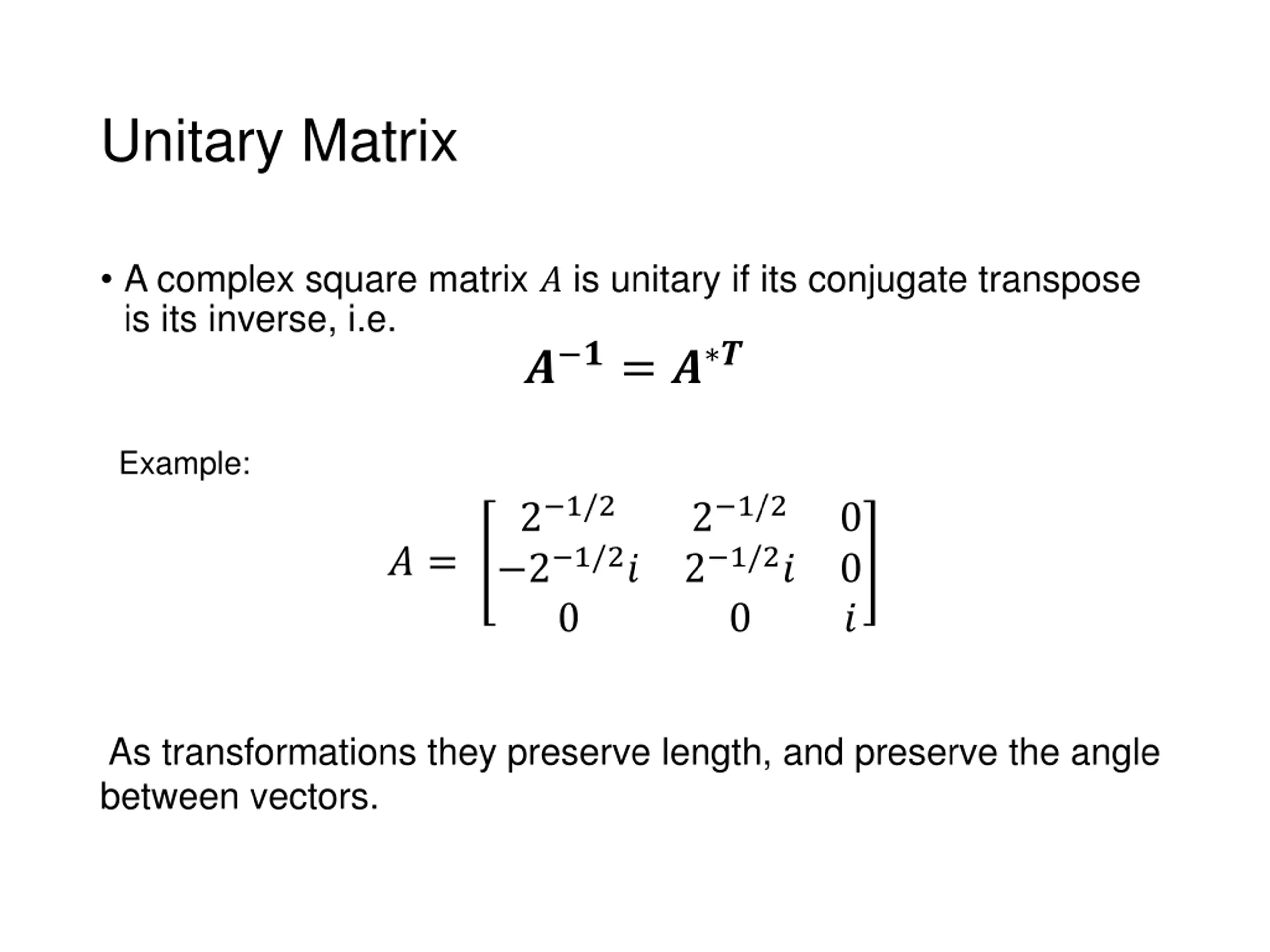 Unitary Matrix A complex square matrix ? is unitary if its conjugate transpose is its inverse, i.e. ? ?= ? ? Example: 2 1/2 2 1/2? 0 2 1/2 2 1/2? 0 0 0 ? ? = As transformations they preserve length, and preserve the angle between vectors.