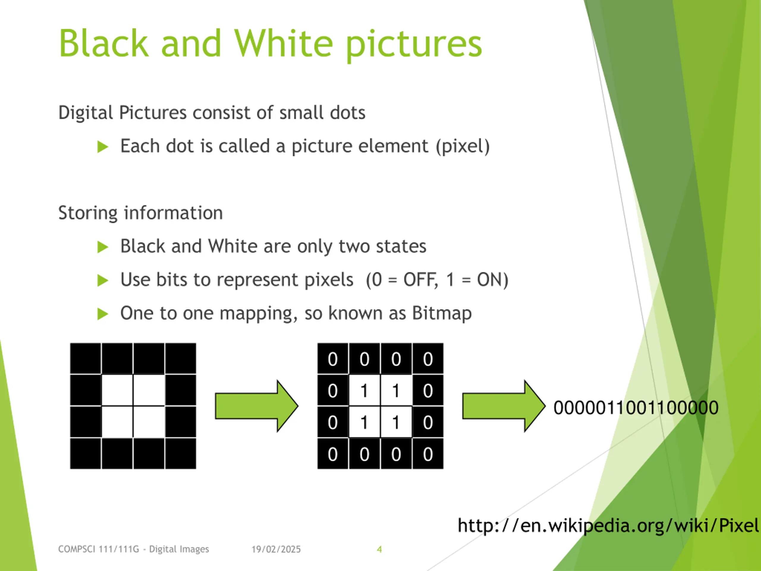 Black and White pictures Digital Pictures consist of small dots Each dot is called a picture element (pixel) Storing information Black and White are only two states Use bits to represent pixels (0 = OFF, 1 = ON) One to one mapping, so known as Bitmap 0 0 0 0 0 1 1 0 1 1 0 0 0 0 0000011001100000 0 0 http://en.wikipedia.org/wiki/Pixel COMPSCI 111/111G - Digital Images 19/02/2025 4
