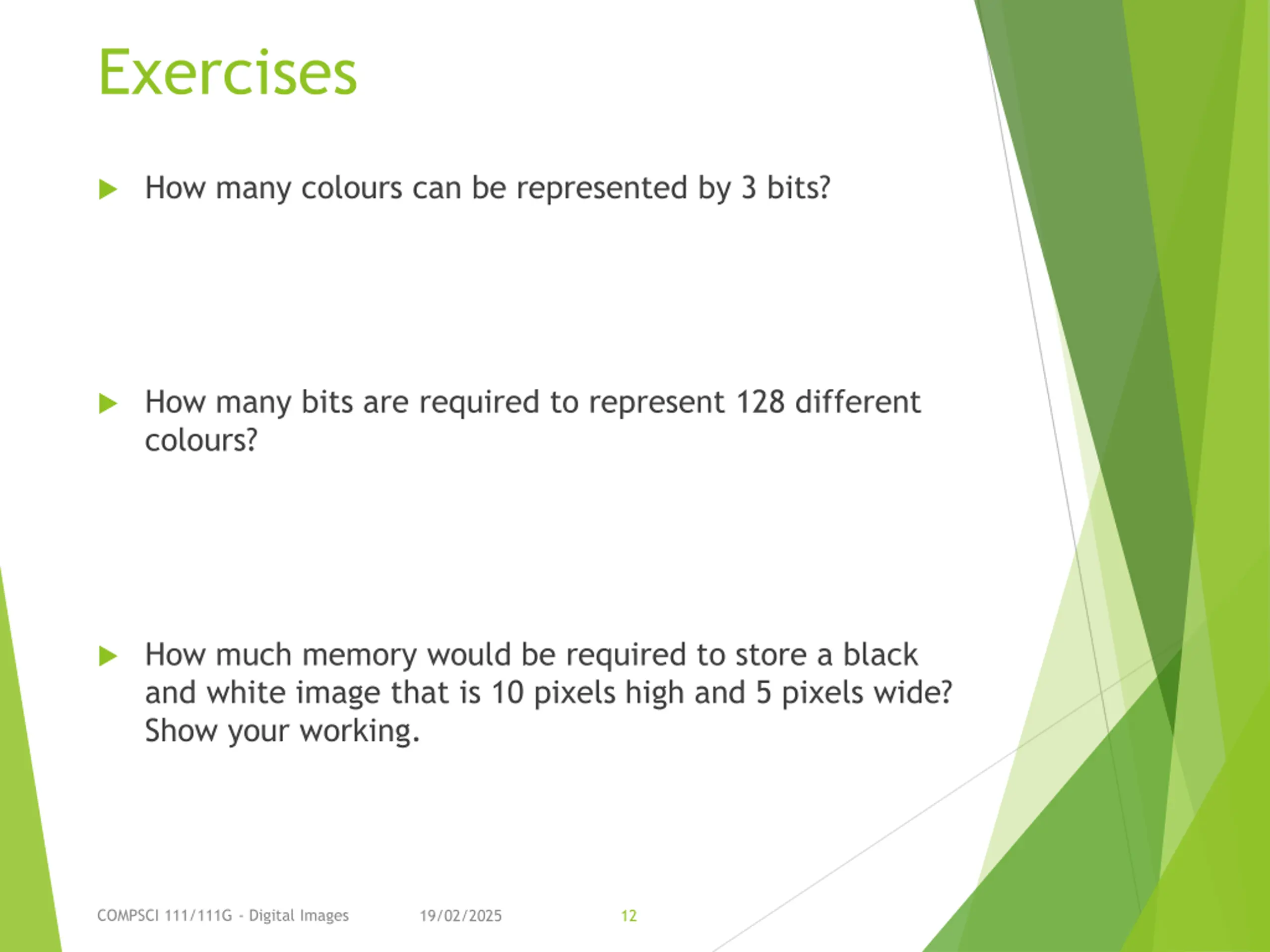 Exercises How many colours can be represented by 3 bits? How many bits are required to represent 128 different colours? How much memory would be required to store a black and white image that is 10 pixels high and 5 pixels wide? Show your working. COMPSCI 111/111G - Digital Images 19/02/2025 12