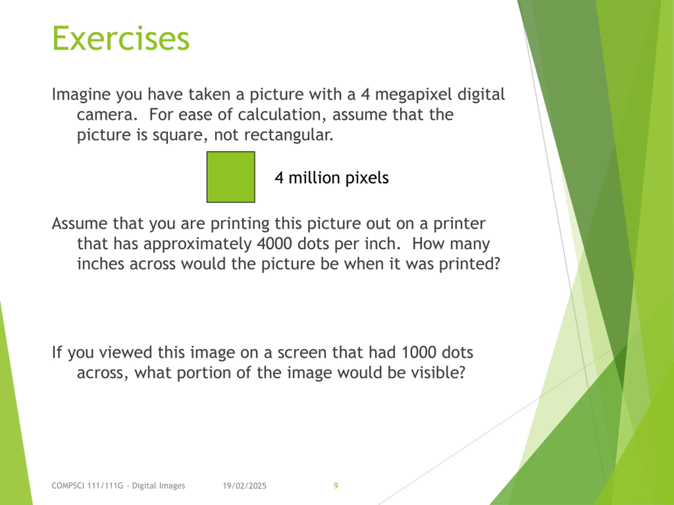 Exercises Imagine you have taken a picture with a 4 megapixel digital camera. For ease of calculation, assume that the picture is square, not rectangular. 4 million pixels Assume that you are printing this picture out on a printer that has approximately 4000 dots per inch. How many inches across would the picture be when it was printed? If you viewed this image on a screen that had 1000 dots across, what portion of the image would be visible? COMPSCI 111/111G - Digital Images 19/02/2025 9