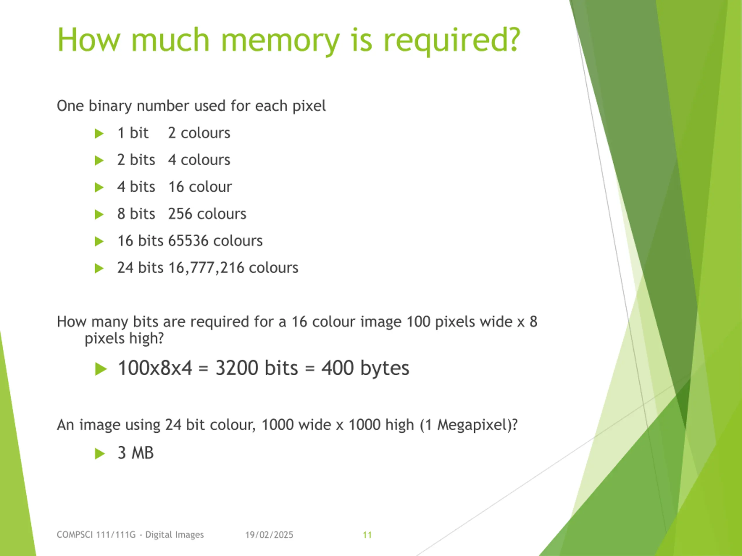 How much memory is required? One binary number used for each pixel 1 bit 2 colours 2 bits 4 colours 4 bits 16 colour 8 bits 256 colours 16 bits 65536 colours 24 bits 16,777,216 colours How many bits are required for a 16 colour image 100 pixels wide x 8 pixels high? 100x8x4 = 3200 bits = 400 bytes An image using 24 bit colour, 1000 wide x 1000 high (1 Megapixel)? 3 MB COMPSCI 111/111G - Digital Images 19/02/2025 11
