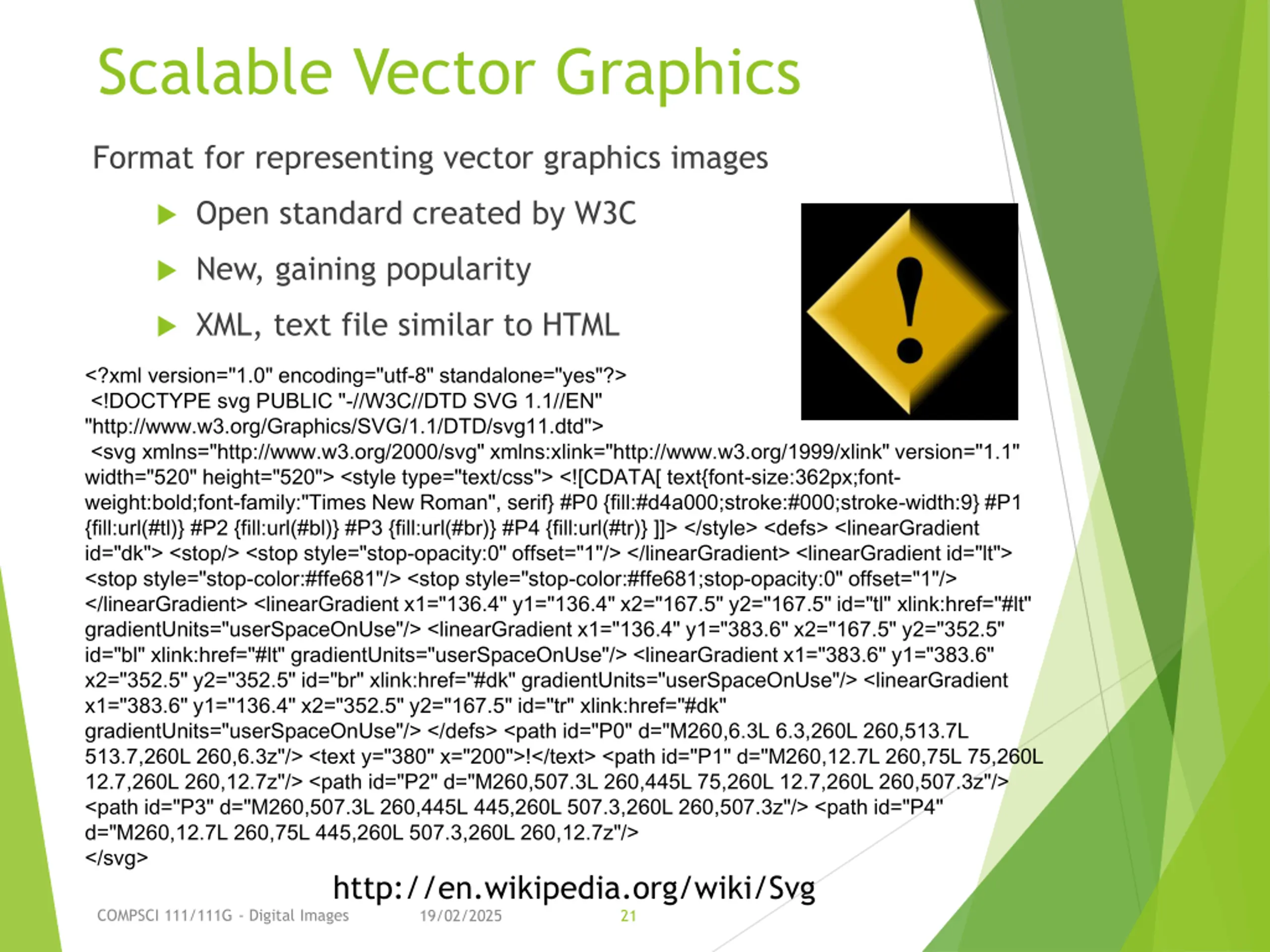 Scalable Vector Graphics Format for representing vector graphics images Open standard created by W3C New, gaining popularity XML, text file similar to HTML <?xml version="1.0" encoding="utf-8" standalone="yes"?> <!DOCTYPE svg PUBLIC "-//W3C//DTD SVG 1.1//EN" "http://www.w3.org/Graphics/SVG/1.1/DTD/svg11.dtd"> <svg xmlns="http://www.w3.org/2000/svg" xmlns:xlink="http://www.w3.org/1999/xlink" version="1.1" width="520" height="520"> <style type="text/css"> <![CDATA[ text{font-size:362px;font- weight:bold;font-family:"Times New Roman", serif} #P0 {fill:#d4a000;stroke:#000;stroke-width:9} #P1 {fill:url(#tl)} #P2 {fill:url(#bl)} #P3 {fill:url(#br)} #P4 {fill:url(#tr)} ]]> </style> <defs> <linearGradient id="dk"> <stop/> <stop style="stop-opacity:0" offset="1"/> </linearGradient> <linearGradient id="lt"> <stop style="stop-color:#ffe681"/> <stop style="stop-color:#ffe681;stop-opacity:0" offset="1"/> </linearGradient> <linearGradient x1="136.4" y1="136.4" x2="167.5" y2="167.5" id="tl" xlink:href="#lt" gradientUnits="userSpaceOnUse"/> <linearGradient x1="136.4" y1="383.6" x2="167.5" y2="352.5" id="bl" xlink:href="#lt" gradientUnits="userSpaceOnUse"/> <linearGradient x1="383.6" y1="383.6" x2="352.5" y2="352.5" id="br" xlink:href="#dk" gradientUnits="userSpaceOnUse"/> <linearGradient x1="383.6" y1="136.4" x2="352.5" y2="167.5" id="tr" xlink:href="#dk" gradientUnits="userSpaceOnUse"/> </defs> <path id="P0" d="M260,6.3L 6.3,260L 260,513.7L 513.7,260L 260,6.3z"/> <text y="380" x="200">!</text> <path id="P1" d="M260,12.7L 260,75L 75,260L 12.7,260L 260,12.7z"/> <path id="P2" d="M260,507.3L 260,445L 75,260L 12.7,260L 260,507.3z"/> <path id="P3" d="M260,507.3L 260,445L 445,260L 507.3,260L 260,507.3z"/> <path id="P4" d="M260,12.7L 260,75L 445,260L 507.3,260L 260,12.7z"/> </svg> http://en.wikipedia.org/wiki/Svg COMPSCI 111/111G - Digital Images 19/02/2025 21