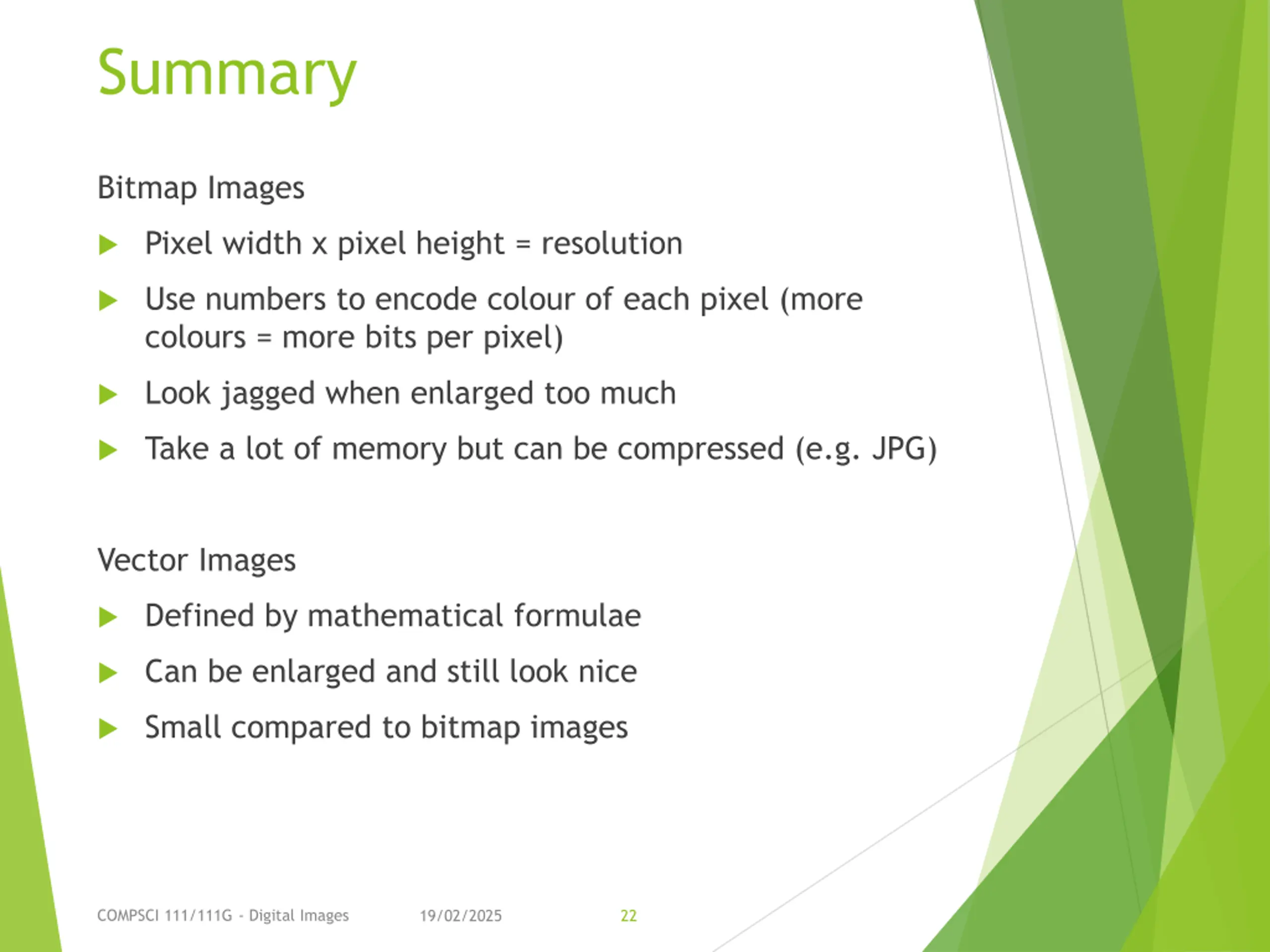 Summary Bitmap Images Pixel width x pixel height = resolution Use numbers to encode colour of each pixel (more colours = more bits per pixel) Look jagged when enlarged too much Take a lot of memory but can be compressed (e.g. JPG) Vector Images Defined by mathematical formulae Can be enlarged and still look nice Small compared to bitmap images COMPSCI 111/111G - Digital Images 19/02/2025 22