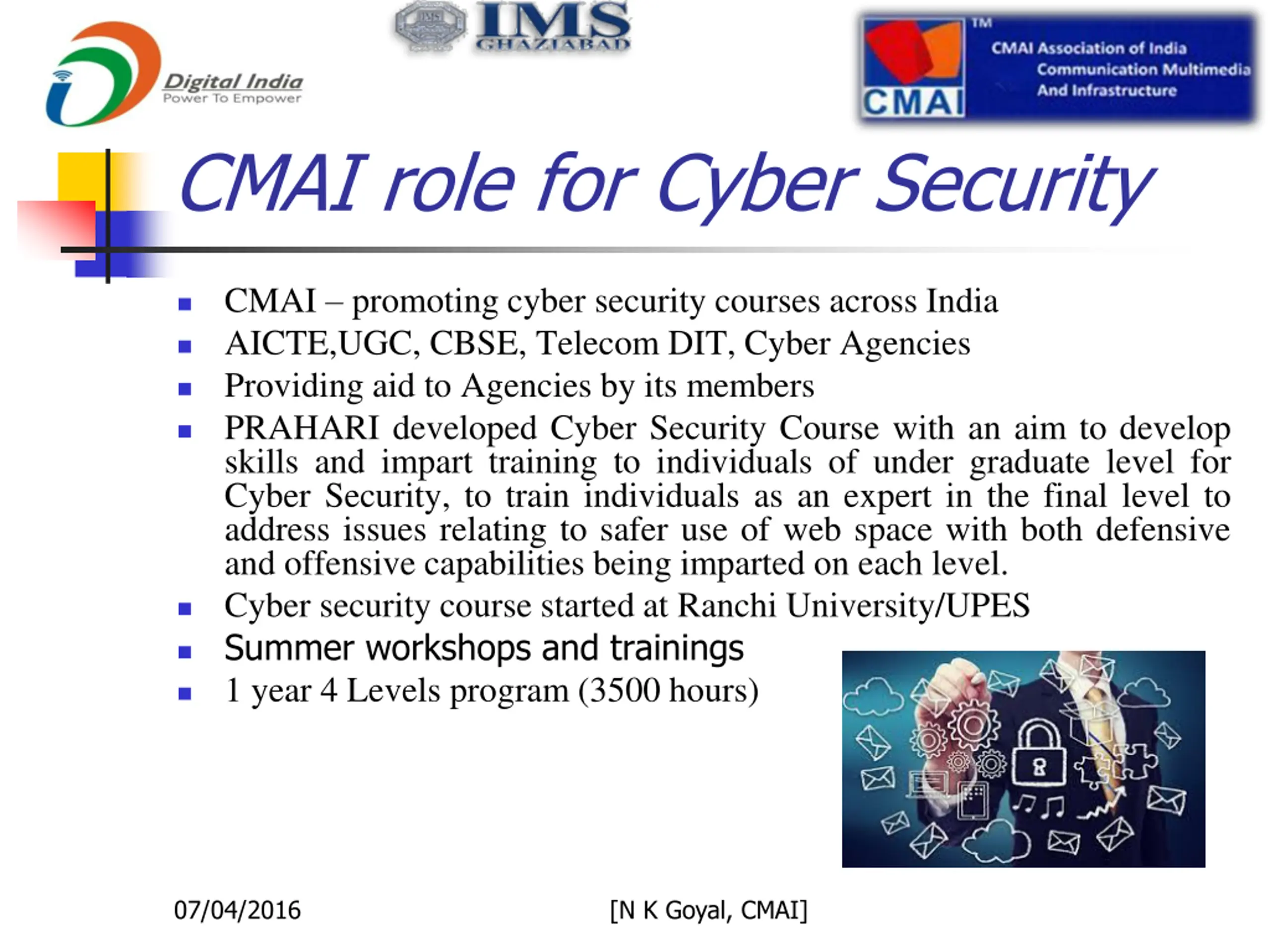 CMAI role for Cyber Security CMAI promoting cyber security courses across India AICTE,UGC, CBSE, Telecom DIT, Cyber Agencies Providing aid to Agencies by its members PRAHARI developed Cyber Security Course with an aim to develop skills and impart training to individuals of under graduate level for Cyber Security, to train individuals as an expert in the final level to address issues relating to safer use of web space with both defensive and offensive capabilities being imparted on each level. Cyber security course started at Ranchi University/UPES Summer workshops and trainings 1 year 4 Levels program (3500 hours) 07/04/2016 [N K Goyal, CMAI]