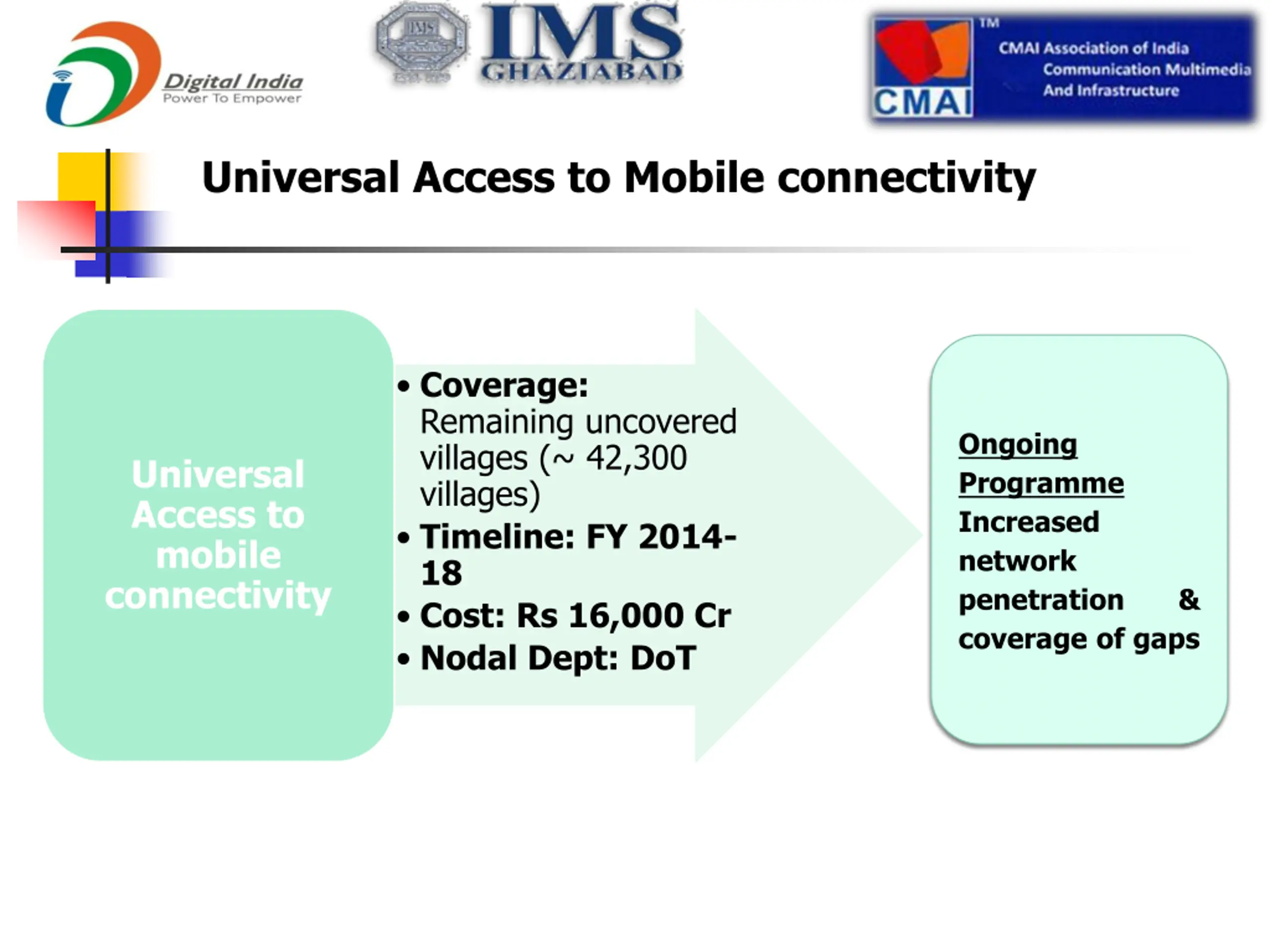 Pillar 2. Universal Access to Mobile connectivity Coverage: Remaining uncovered villages (~ 42,300 villages) Timeline: FY 2014- 18 Cost: Rs 16,000 Cr Nodal Dept: DoT Ongoing Programme Increased network penetration coverage of gaps Universal Access to mobile connectivity &