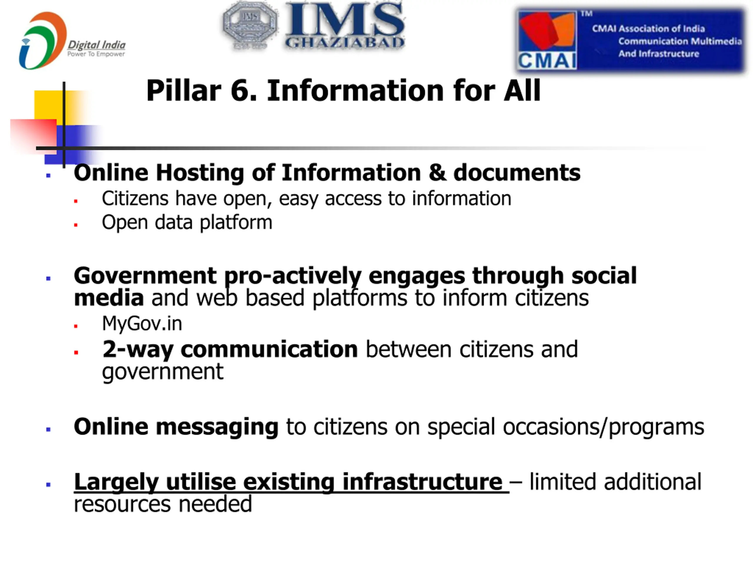 Pillar 6. Information for All Online Hosting of Information & documents Citizens have open, easy access to information Open data platform Government pro-actively engages through social media and web based platforms to inform citizens MyGov.in 2-way communication between citizens and government Online messaging to citizens on special occasions/programs Largely utilise existing infrastructure limited additional resources needed