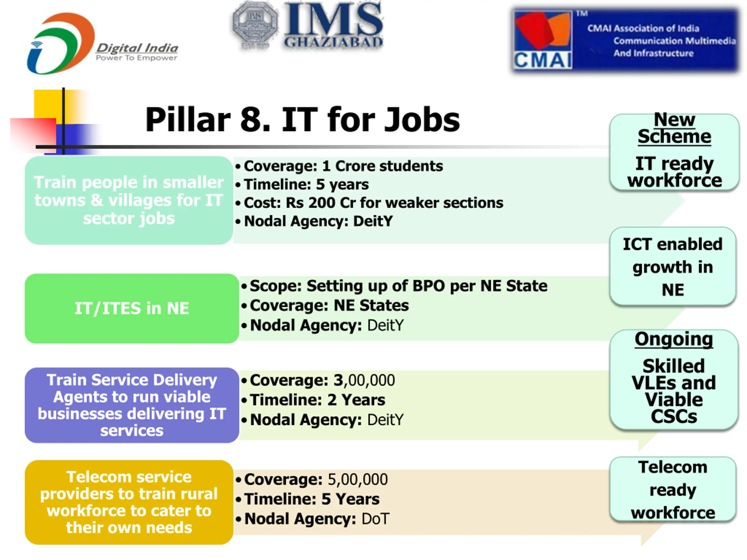 Pillar 8. IT for Jobs New Scheme IT ready workforce Coverage: 1 Crore students Timeline: 5 years Cost: Rs 200 Cr for weaker sections Nodal Agency: DeitY Train people in smaller towns & villages for IT sector jobs ICT enabled growth in NE Scope: Setting up of BPO per NE State Coverage: NE States Nodal Agency: DeitY IT/ITES in NE Ongoing Skilled VLEs and Viable CSCs Train Service Delivery Agents to run viable businesses delivering IT services Coverage: 3,00,000 Timeline: 2 Years Nodal Agency: DeitY Telecom ready workforce Telecom service providers to train rural workforce to cater to their own needs Coverage: 5,00,000 Timeline: 5 Years Nodal Agency: DoT