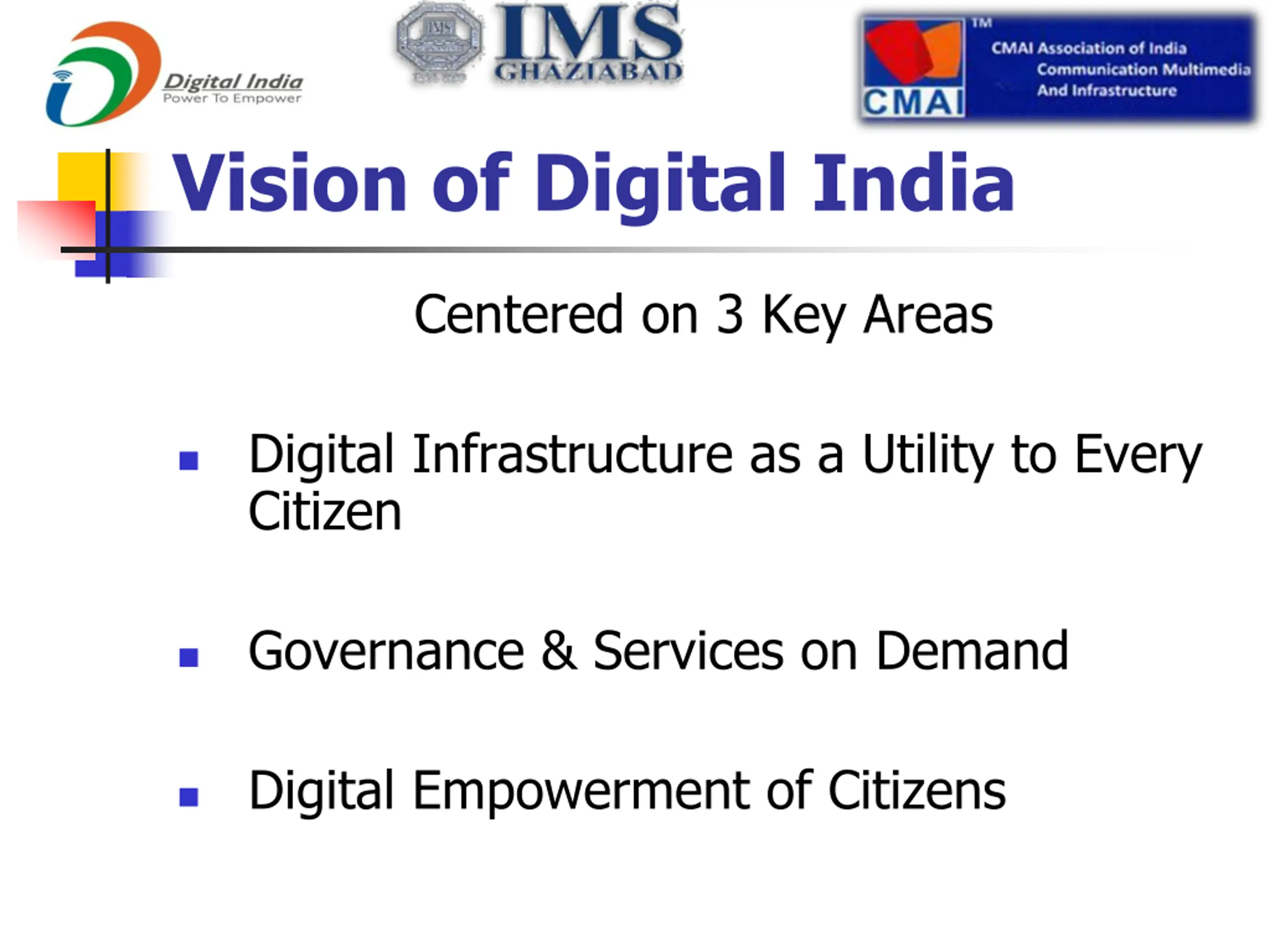 Vision of Digital India Centered on 3 Key Areas Digital Infrastructure as a Utility to Every Citizen Governance & Services on Demand Digital Empowerment of Citizens