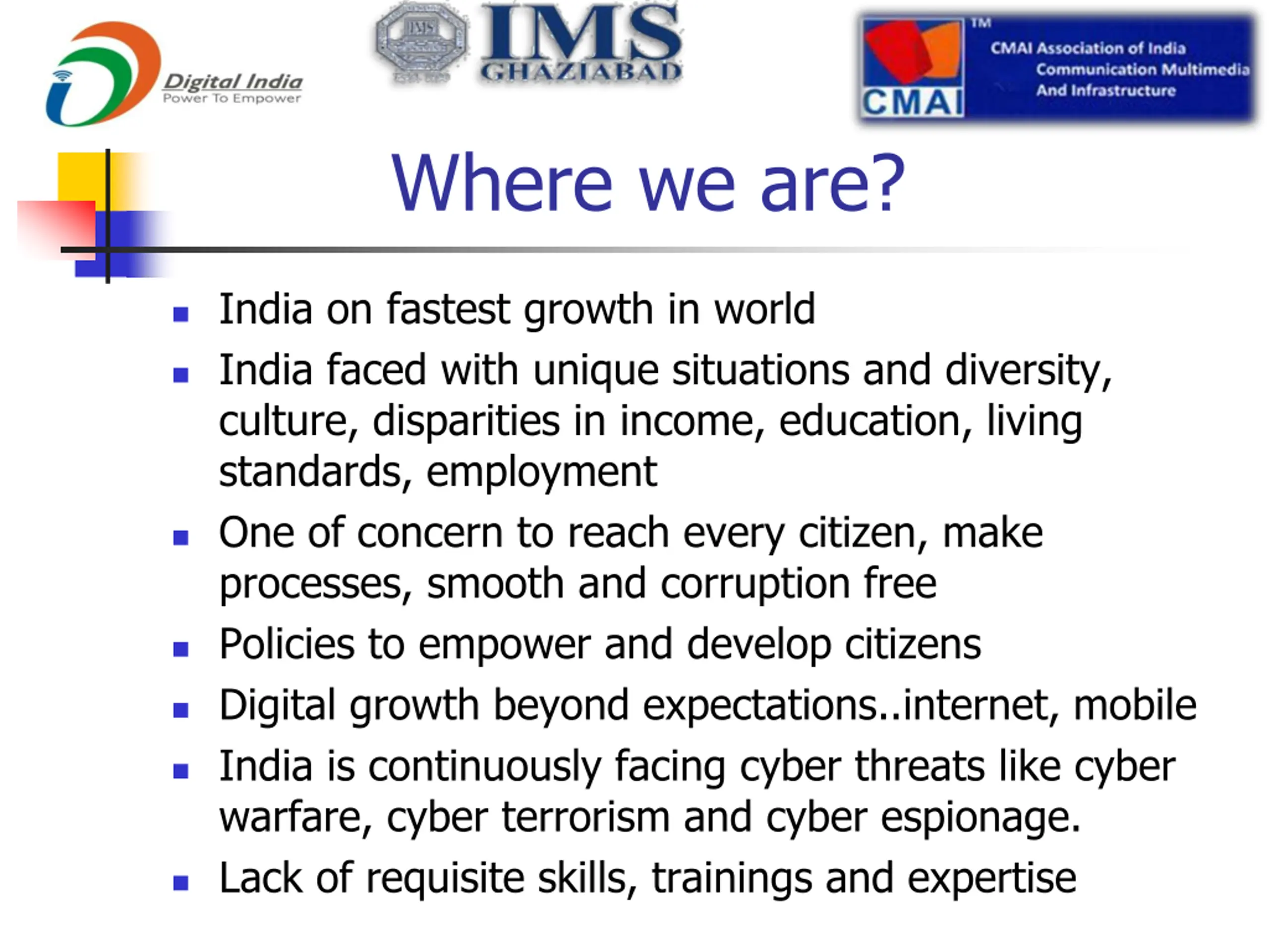 Where we are? India on fastest growth in world India faced with unique situations and diversity, culture, disparities in income, education, living standards, employment One of concern to reach every citizen, make processes, smooth and corruption free Policies to empower and develop citizens Digital growth beyond expectations..internet, mobile India is continuously facing cyber threats like cyber warfare, cyber terrorism and cyber espionage. Lack of requisite skills, trainings and expertise