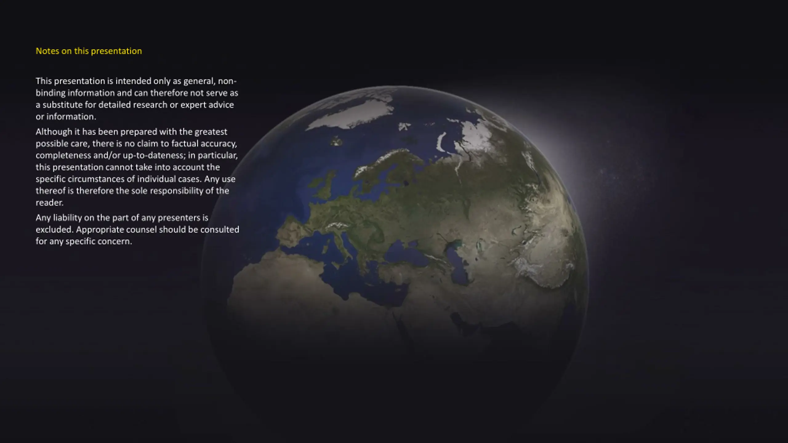 Notes on this presentation This presentation is intended only as general, non- binding information and can therefore not serve as a substitute for detailed research or expert advice or information. Although it has been prepared with the greatest possible care, there is no claim to factual accuracy, completeness and/or up-to-dateness; in particular, this presentation cannot take into account the specific circumstances of individual cases. Any use thereof is therefore the sole responsibility of the reader. Any liability on the part of any presenters is excluded. Appropriate counsel should be consulted for any specific concern.