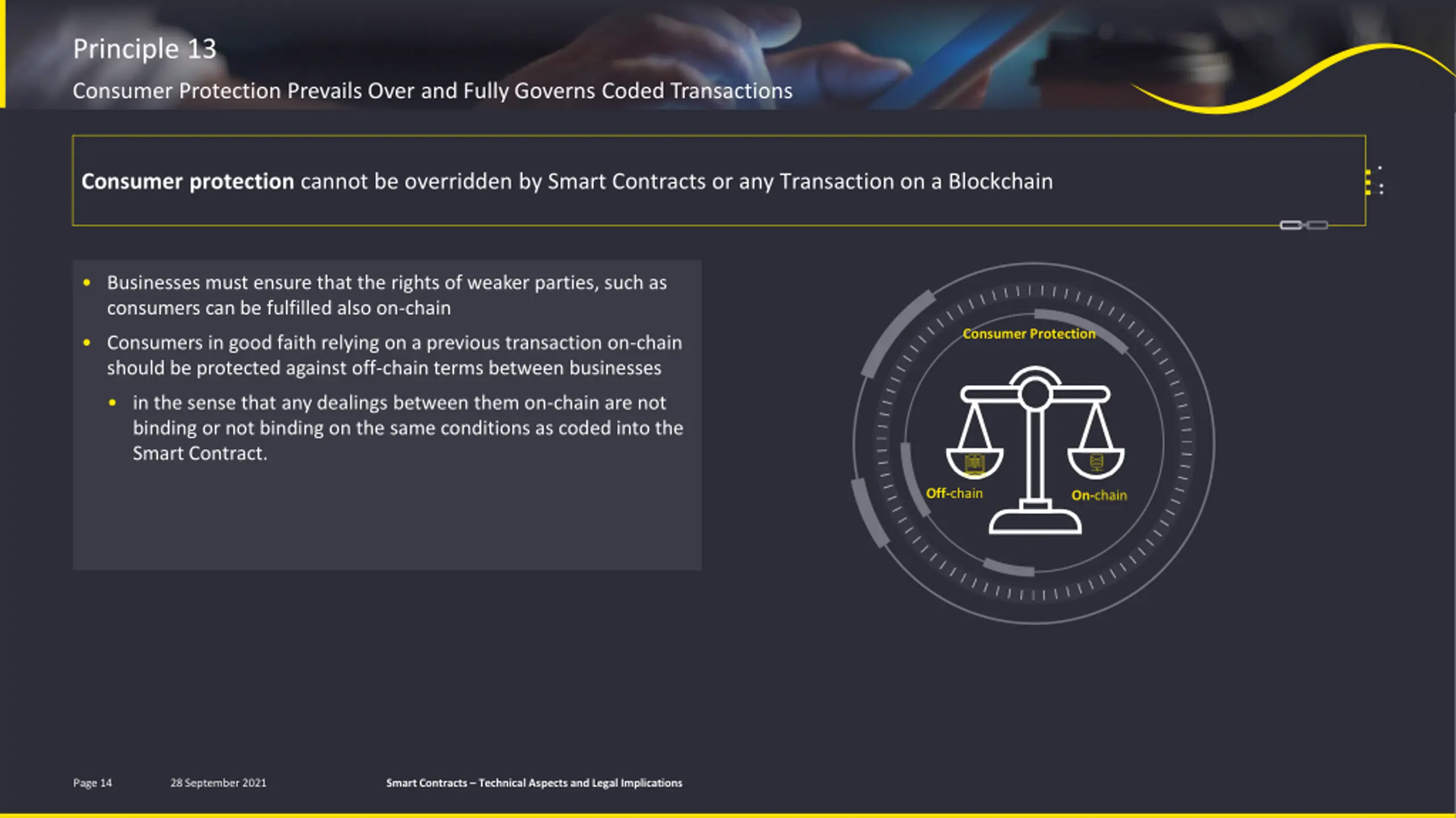Principle 13 Consumer Protection Prevails Over and Fully Governs Coded Transactions 13 a) Consumer protection cannot be overridden by Smart Contracts or any Transaction on a Blockchain Consumer protection on-chain must be at least equivalent to Consumer protection off-chain. Consumer Protection Consumers must not be deprived of any rights they might have had if the platform had not been used or the legally binding agreement had been concluded off-chain Off-chain On-chain Page 13 28 September 2021 Smart Contracts Technical Aspects and Legal Implications