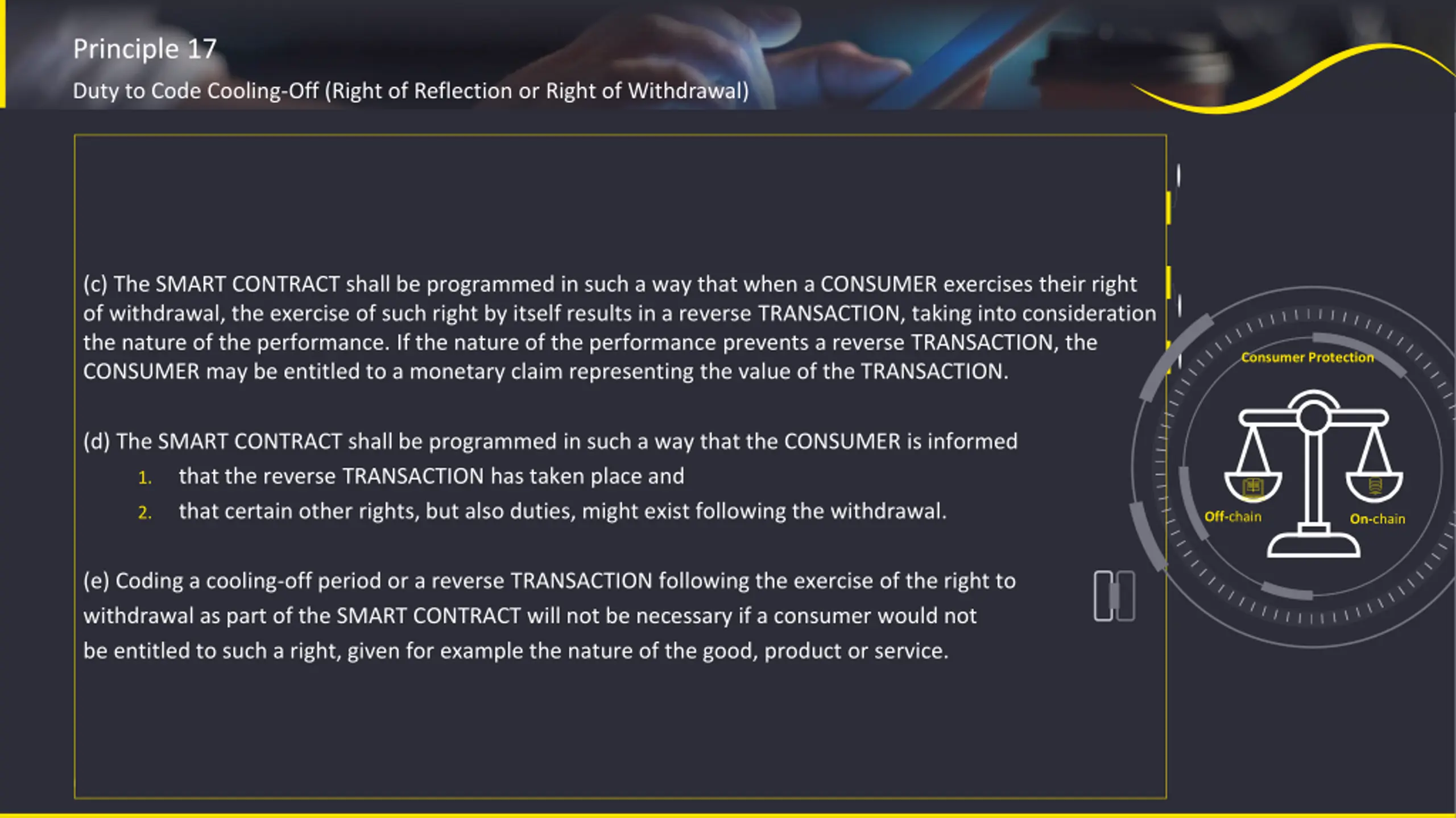 Principle 17 Duty to Code Cooling-Off (Right of Reflection or Right of Withdrawal) (c) The SMART CONTRACT shall be programmed in such a way that when a CONSUMER exercises their right of withdrawal, the exercise of such right by itself results in a reverse TRANSACTION, taking into consideration the nature of the performance. If the nature of the performance prevents a reverse TRANSACTION, the CONSUMER may be entitled to a monetary claim representing the value of the TRANSACTION. Consumer Protection (d) The SMART CONTRACT shall be programmed in such a way that the CONSUMER is informed that the reverse TRANSACTION has taken place and that certain other rights, but also duties, might exist following the withdrawal. 1. 2. Off-chain On-chain (e) Coding a cooling-off period or a reverse TRANSACTION following the exercise of the right to withdrawal as part of the SMART CONTRACT will not be necessary if a consumer would not be entitled to such a right, given for example the nature of the good, product or service. Page 17 28 September 2021 Smart Contracts Technical Aspects and Legal Implications