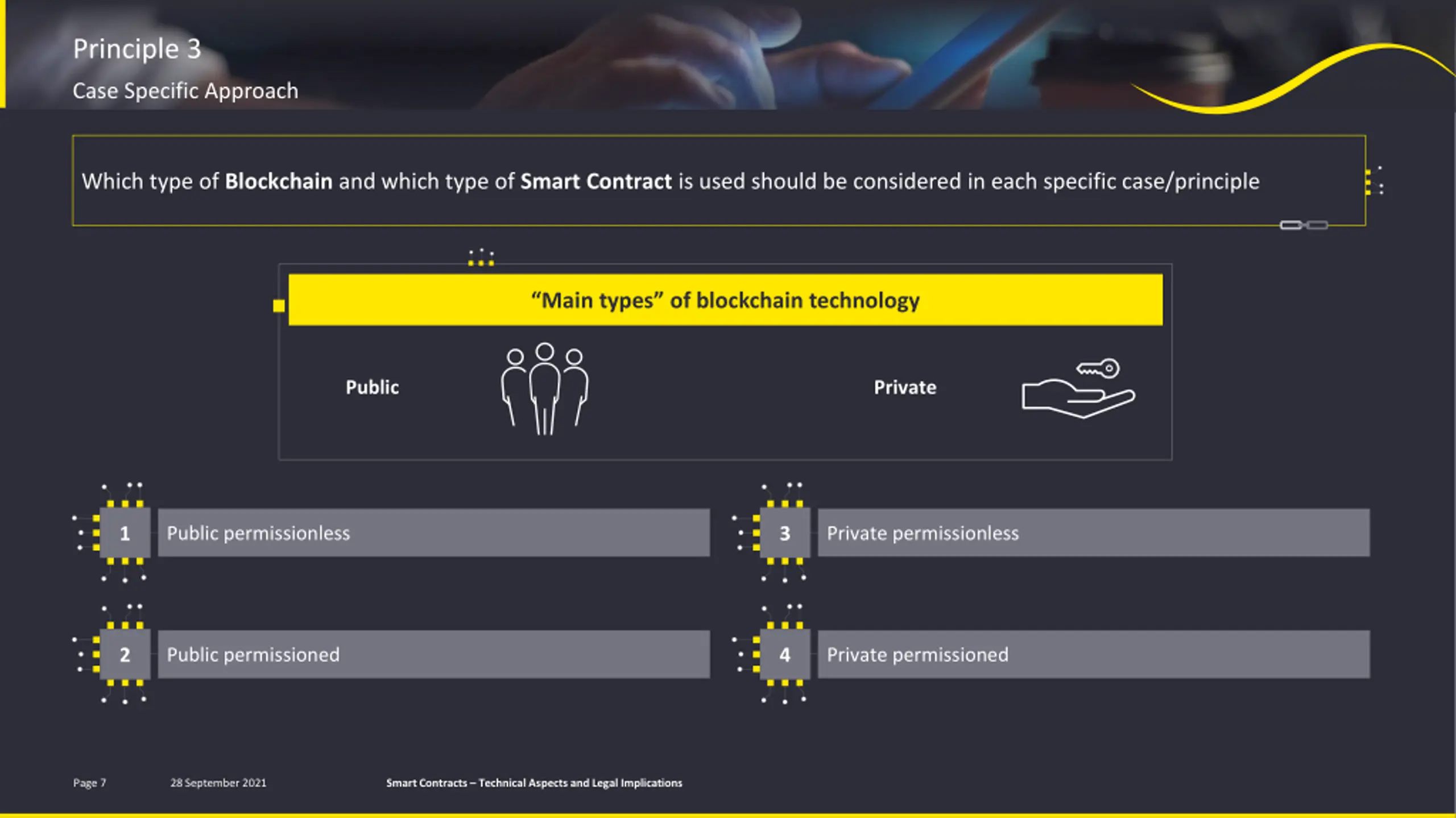 Principle 3 Case Specific Approach Which type of Blockchain and which type of Smart Contract is used should be considered in each specific case/principle Main types of blockchain technology Public Private 1 3 Public permissionless Private permissionless 2 4 Public permissioned Private permissioned Page 7 28 September 2021 Smart Contracts Technical Aspects and Legal Implications