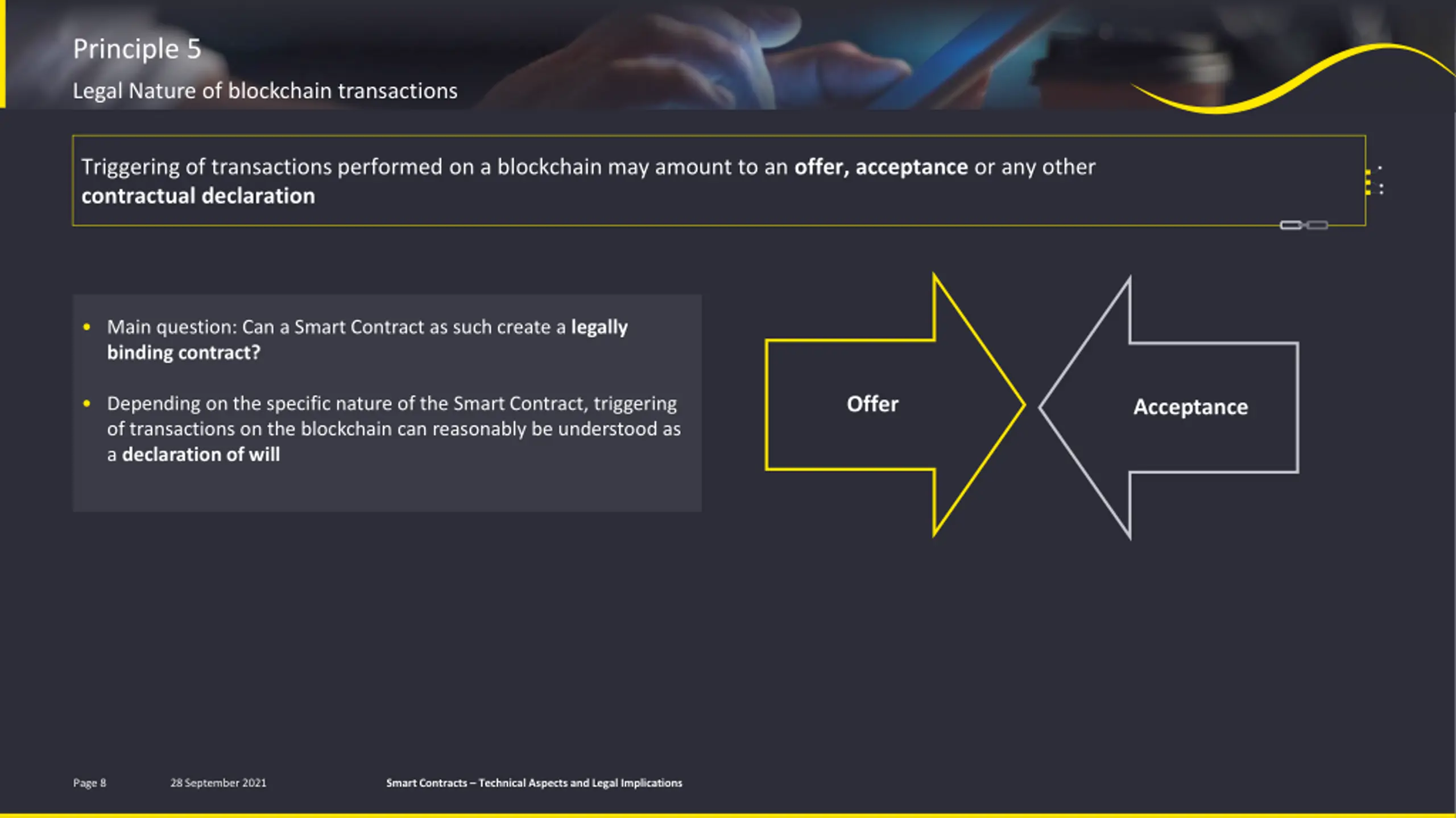 Principle 5 Legal Nature of blockchain transactions Triggering of transactions performed on a blockchain may amount to an offer, acceptance or any other contractual declaration Main question: Can a Smart Contract as such create a legally binding contract? Offer Depending on the specific nature of the Smart Contract, triggering of transactions on the blockchain can reasonably be understood as a declaration of will Acceptance Page 8 28 September 2021 Smart Contracts Technical Aspects and Legal Implications