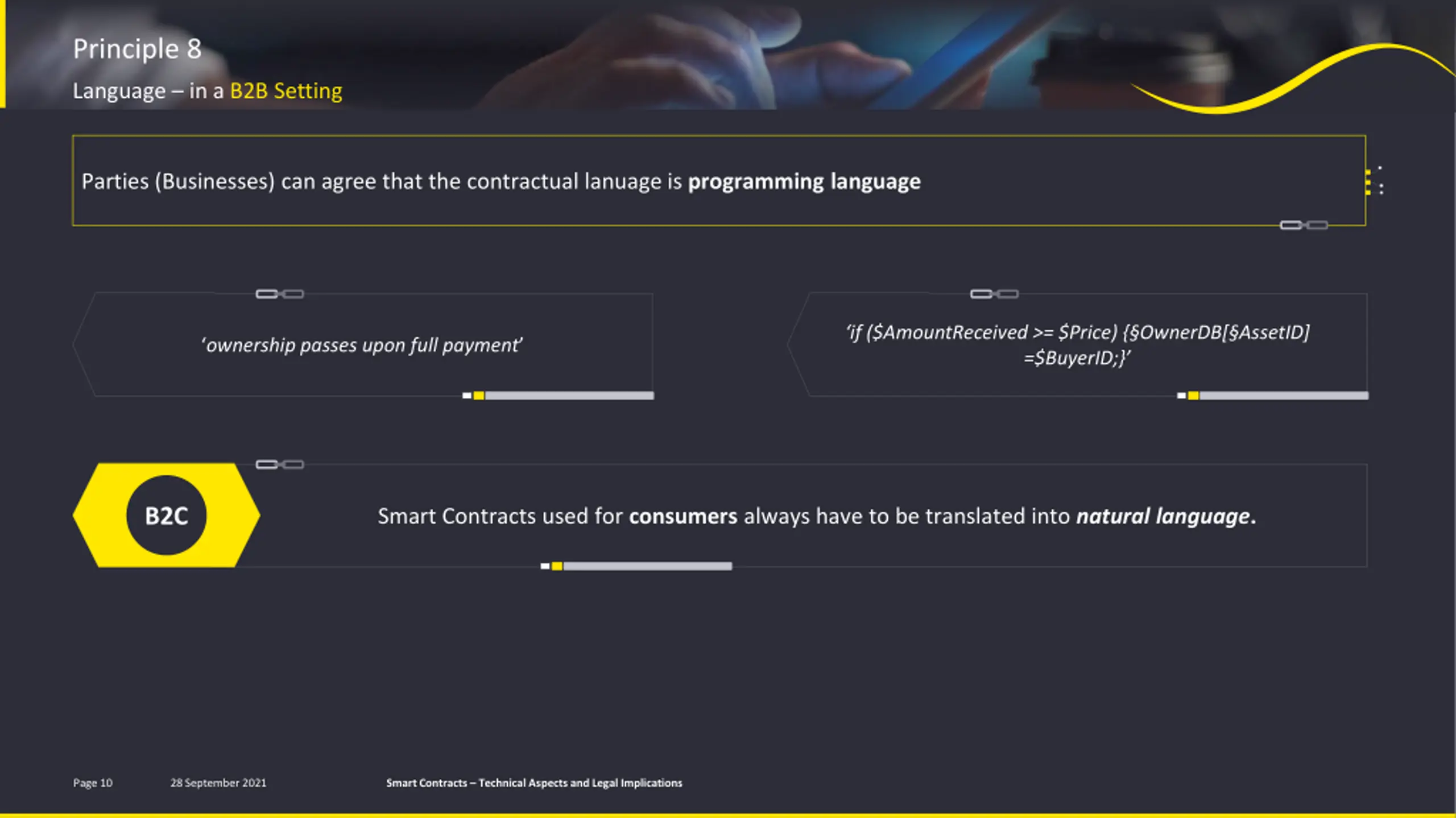 Principle 8 Language in a B2B Setting Parties (Businesses) can agree that the contractual lanuage is programming language if ($AmountReceived >= $Price) { OwnerDB[ AssetID] =$BuyerID;} ownership passes upon full payment B2C Smart Contracts used for consumers always have to be translated into natural language. Page 10 28 September 2021 Smart Contracts Technical Aspects and Legal Implications