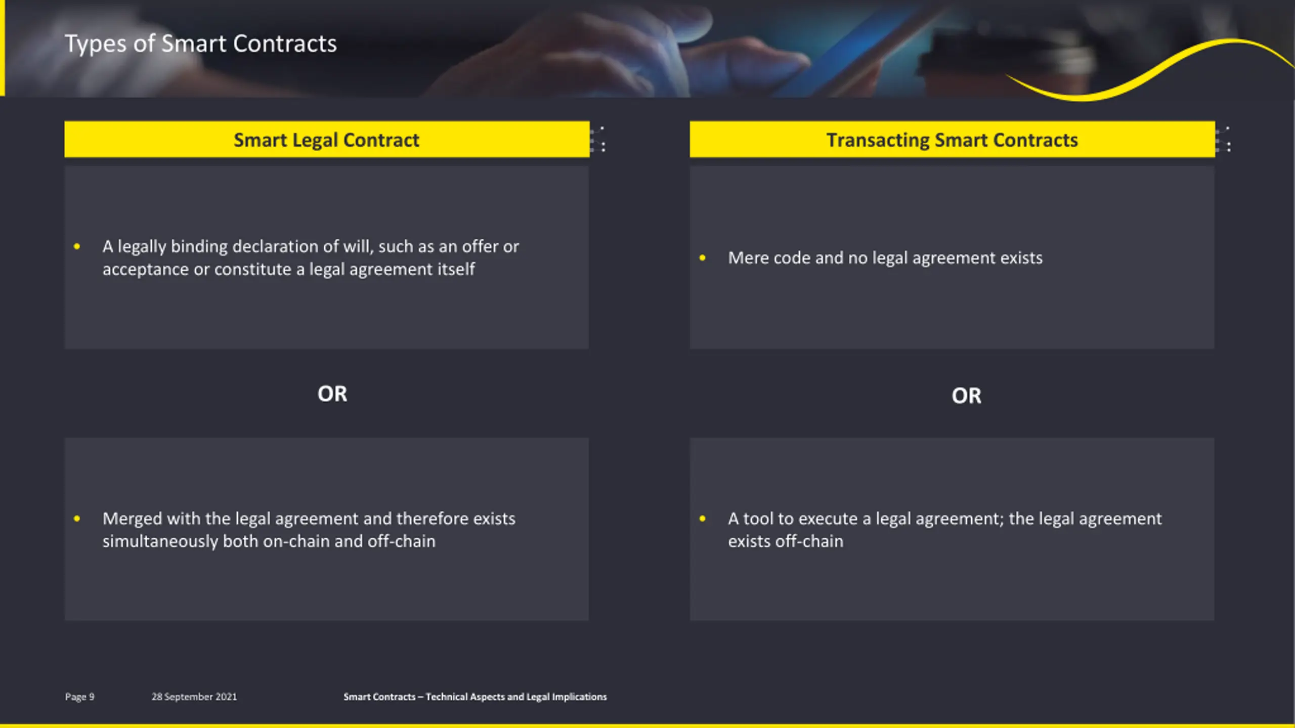 Types of Smart Contracts Smart Legal Contract Transacting Smart Contracts A legally binding declaration of will, such as an offer or acceptance or constitute a legal agreement itself Mere code and no legal agreement exists OR OR Merged with the legal agreement and therefore exists simultaneously both on-chain and off-chain A tool to execute a legal agreement; the legal agreement exists off-chain Page 9 28 September 2021 Smart Contracts Technical Aspects and Legal Implications