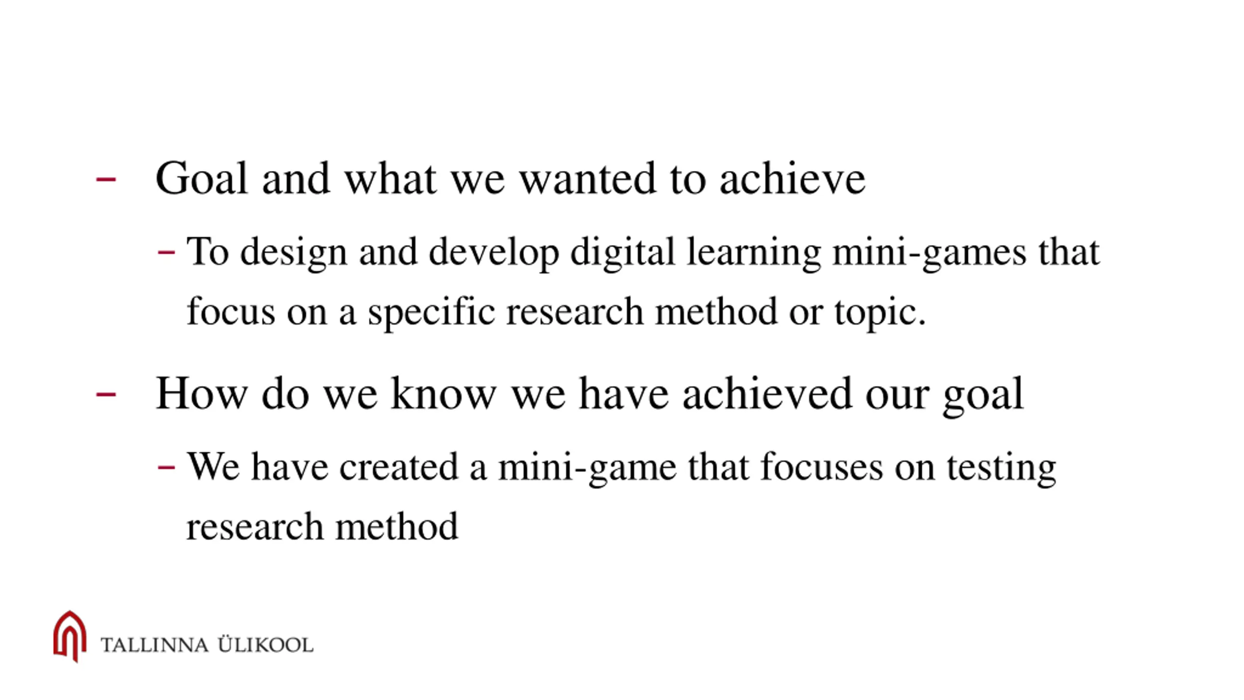 - Goal and what we wanted to achieve - To design and develop digital learning mini-games that focus on a specific research method or topic. - How do we know we have achieved our goal - We have created a mini-game that focuses on testing research method