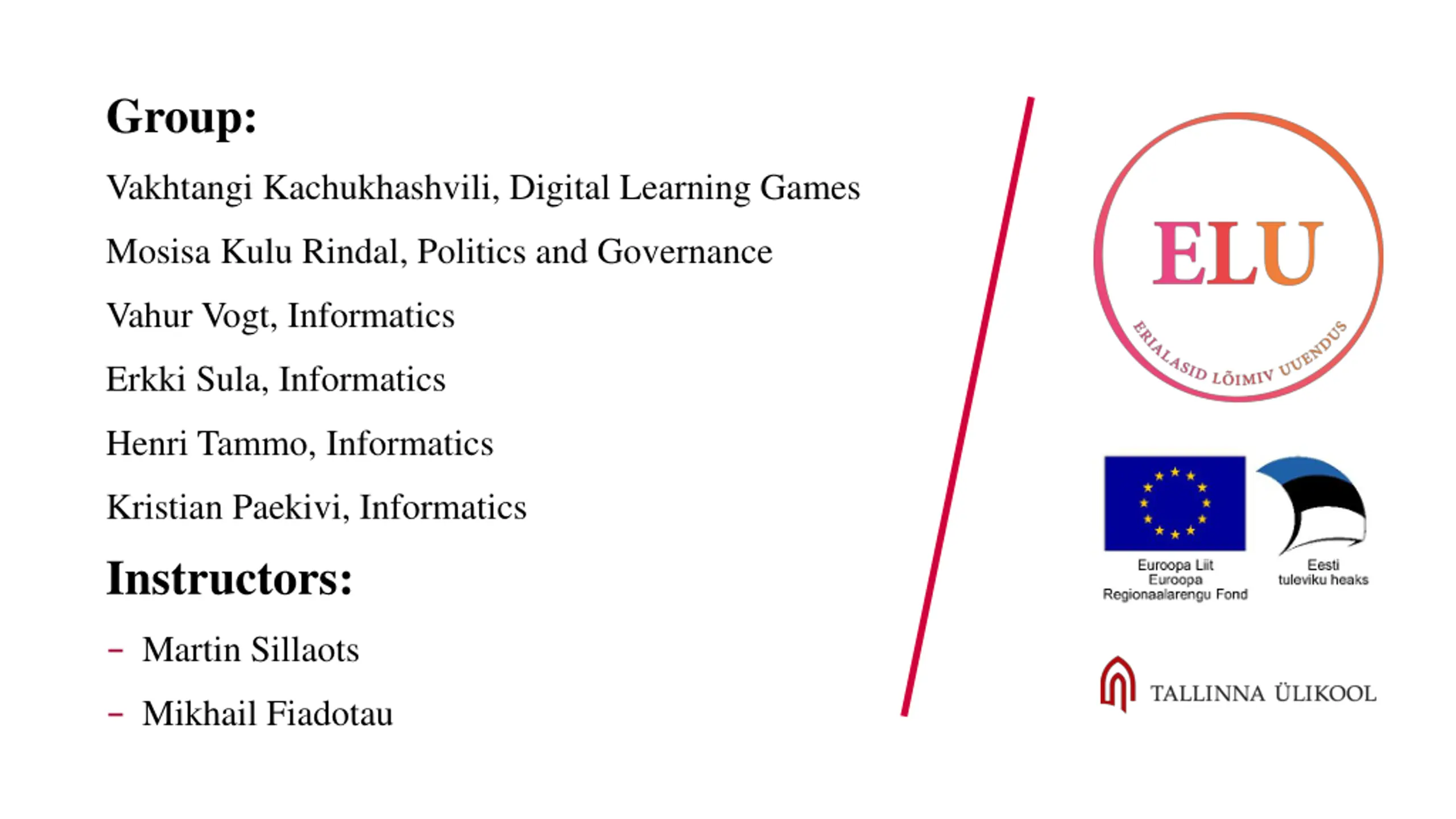 Group: Vakhtangi Kachukhashvili, Digital Learning Games Mosisa Kulu Rindal, Politics and Governance Vahur Vogt, Informatics Erkki Sula, Informatics Henri Tammo, Informatics Kristian Paekivi, Informatics Instructors: - Martin Sillaots - Mikhail Fiadotau