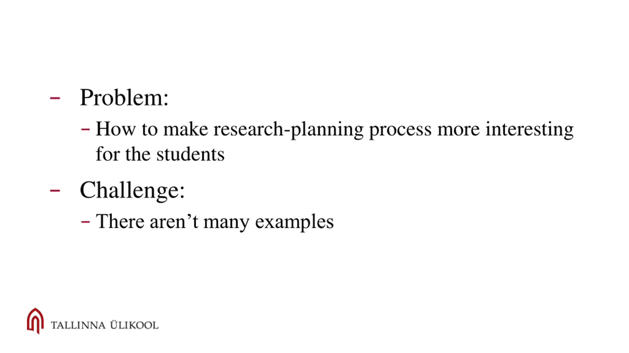 - Problem: - How to make research-planning process more interesting for the students - Challenge: - There aren t many examples
