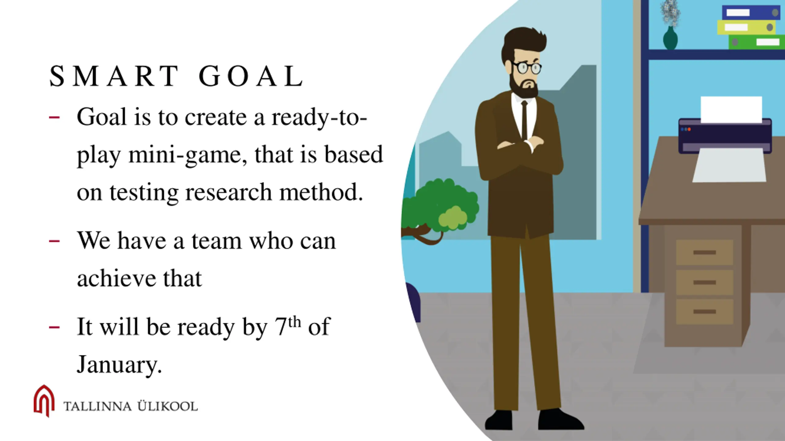 S M A RT G O A L - Goal is to create a ready-to- play mini-game, that is based on testing research method. - We have a team who can achieve that - It will be ready by 7thof January.