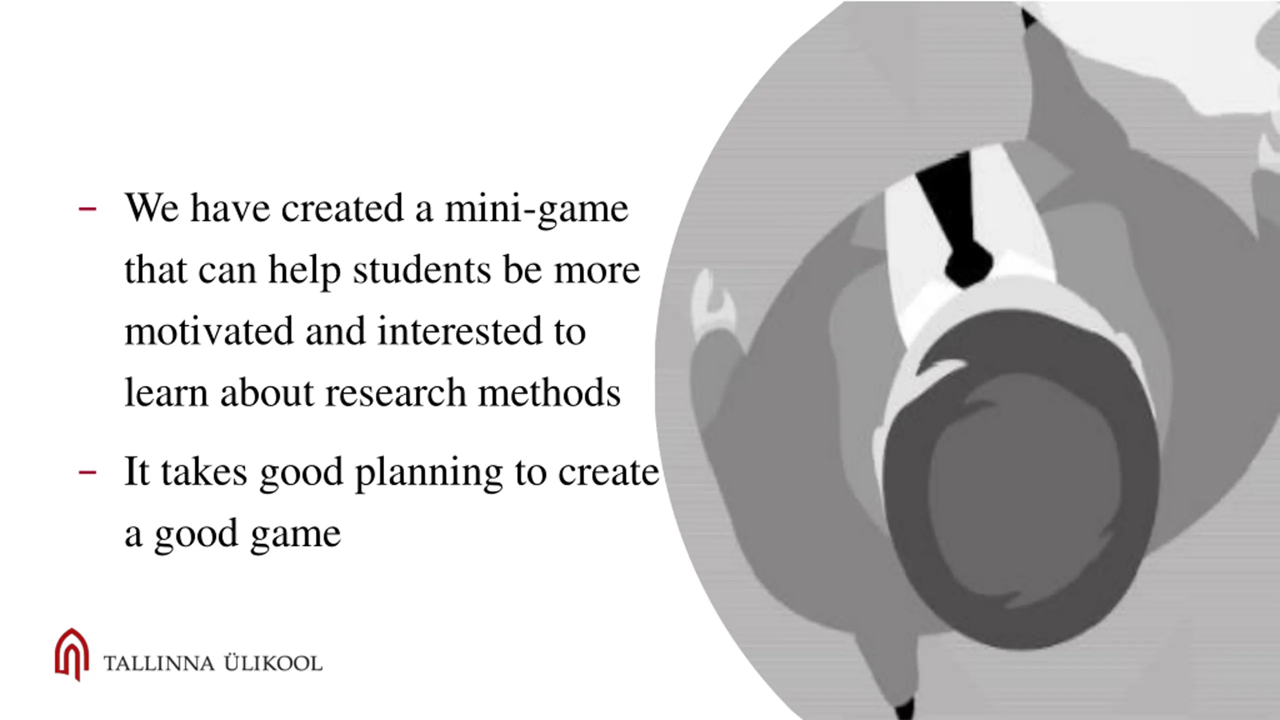 - We have created a mini-game that can help students be more motivated and interested to learn about research methods - It takes good planning to create a good game