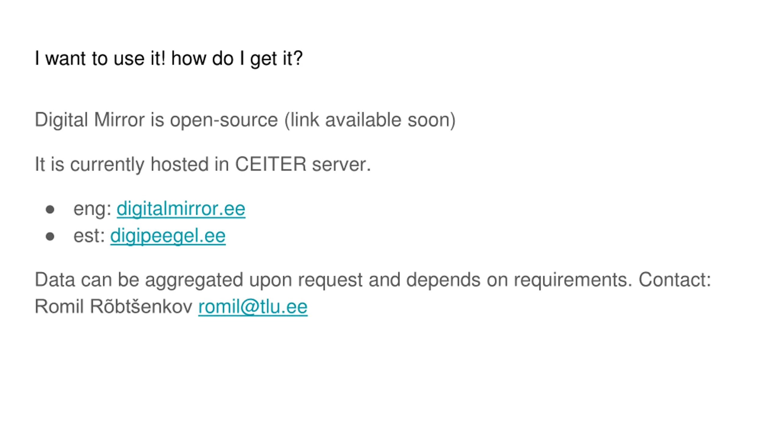 I want to use it! how do I get it? Digital Mirror is open-source (link available soon) It is currently hosted in CEITER server. eng: digitalmirror.ee est: digipeegel.ee Data can be aggregated upon request and depends on requirements. Contact: Romil R bt enkov romil@tlu.ee