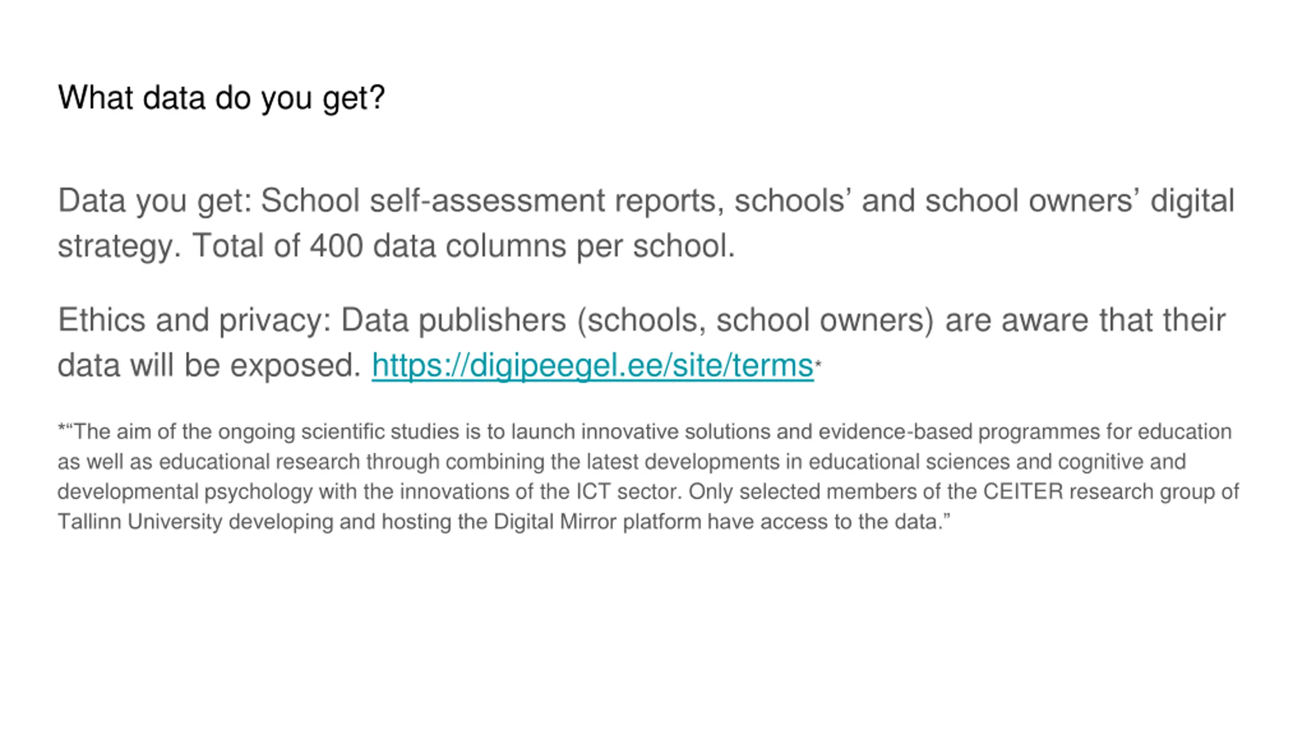 What data do you get? Data you get: School self-assessment reports, schools and school owners digital strategy. Total of 400 data columns per school. Ethics and privacy: Data publishers (schools, school owners) are aware that their data will be exposed. https://digipeegel.ee/site/terms* * The aim of the ongoing scientific studies is to launch innovative solutions and evidence-based programmes for education as well as educational research through combining the latest developments in educational sciences and cognitive and developmental psychology with the innovations of the ICT sector. Only selected members of the CEITER research group of Tallinn University developing and hosting the Digital Mirror platform have access to the data.