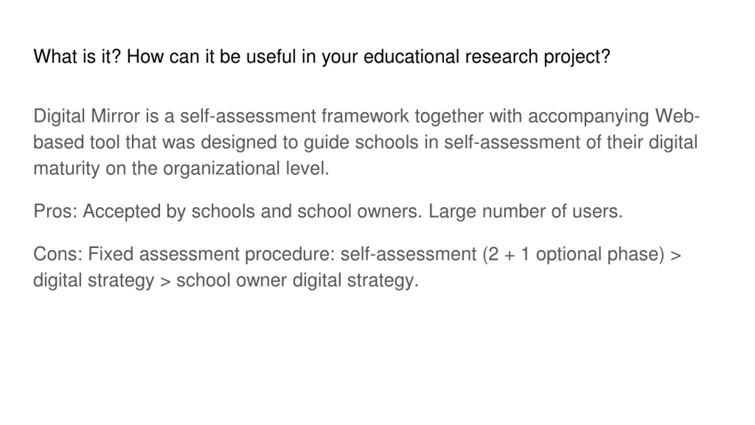 What is it? How can it be useful in your educational research project? Digital Mirror is a self-assessment framework together with accompanying Web- based tool that was designed to guide schools in self-assessment of their digital maturity on the organizational level. Pros: Accepted by schools and school owners. Large number of users. Cons: Fixed assessment procedure: self-assessment (2 + 1 optional phase) > digital strategy > school owner digital strategy.