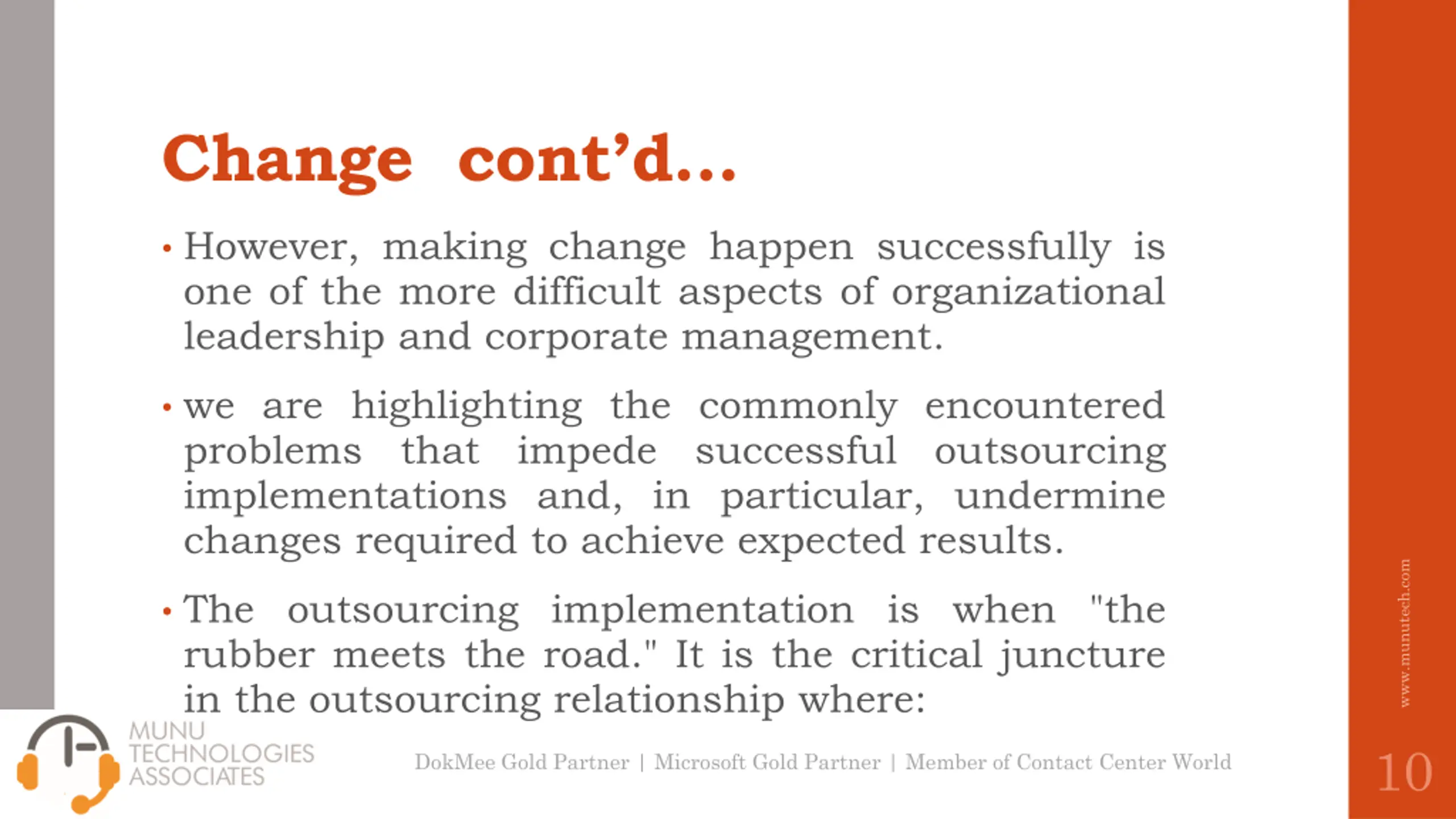 Change contd However, making change happen successfully is one of the more difficult aspects of organizational leadership and corporate management. we are highlighting the commonly encountered problems that impede successful outsourcing implementations and, in particular, undermine changes required to achieve expected results. www.munutech.com The outsourcing implementation is when "the rubber meets the road." It is the critical juncture in the outsourcing relationship where: 10 DokMee Gold Partner | Microsoft Gold Partner | Member of Contact Center World
