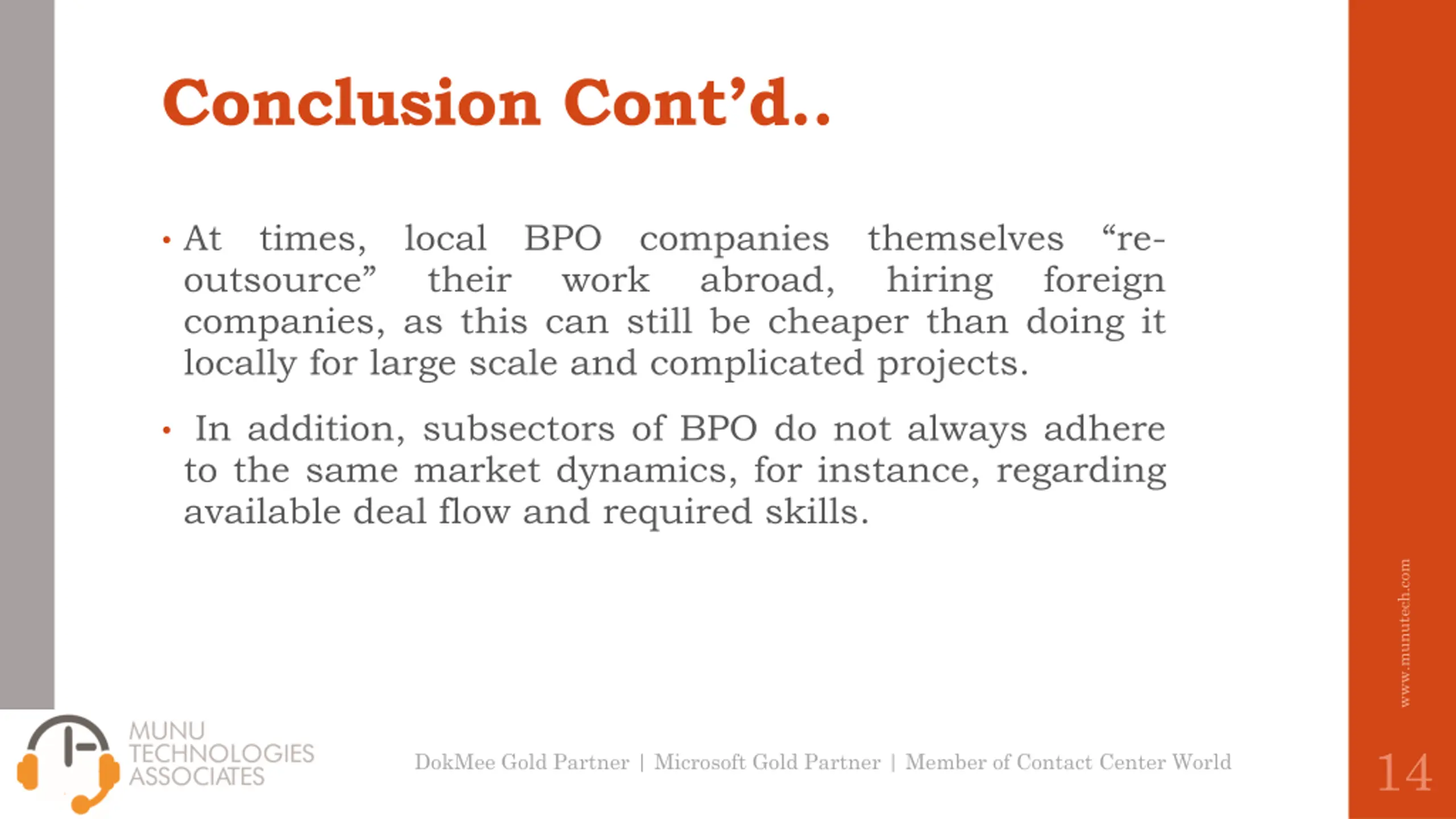 Conclusion Contd.. At times, local BPO companies themselves re- outsource their work companies, as this can still be cheaper than doing it locally for large scale and complicated projects. abroad, hiring foreign In addition, subsectors of BPO do not always adhere to the same market dynamics, for instance, regarding available deal flow and required skills. www.munutech.com 14 DokMee Gold Partner | Microsoft Gold Partner | Member of Contact Center World