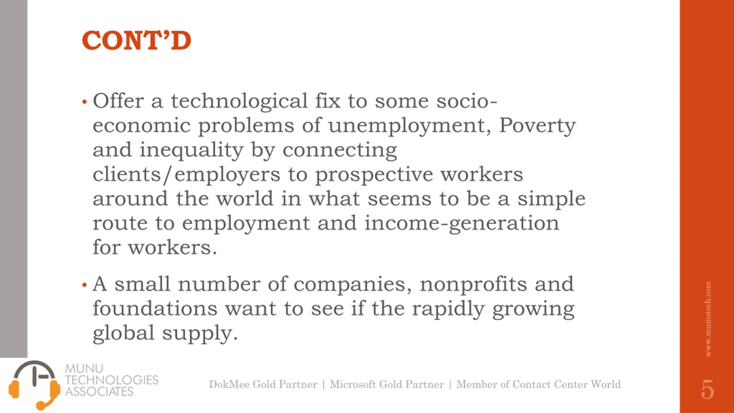 CONTD Offer a technological fix to some socio- economic problems of unemployment, Poverty and inequality by connecting clients/employers to prospective workers around the world in what seems to be a simple route to employment and income-generation for workers. A small number of companies, nonprofits and foundations want to see if the rapidly growing global supply. www.munutech.com 5 DokMee Gold Partner | Microsoft Gold Partner | Member of Contact Center World