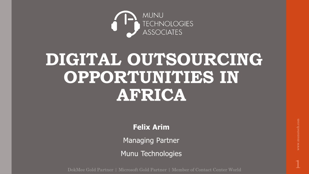 DIGITAL OUTSOURCING OPPORTUNITIES IN AFRICA www.munutech.com Felix Arim Managing Partner Munu Technologies 1 DokMee Gold Partner | Microsoft Gold Partner | Member of Contact Center World