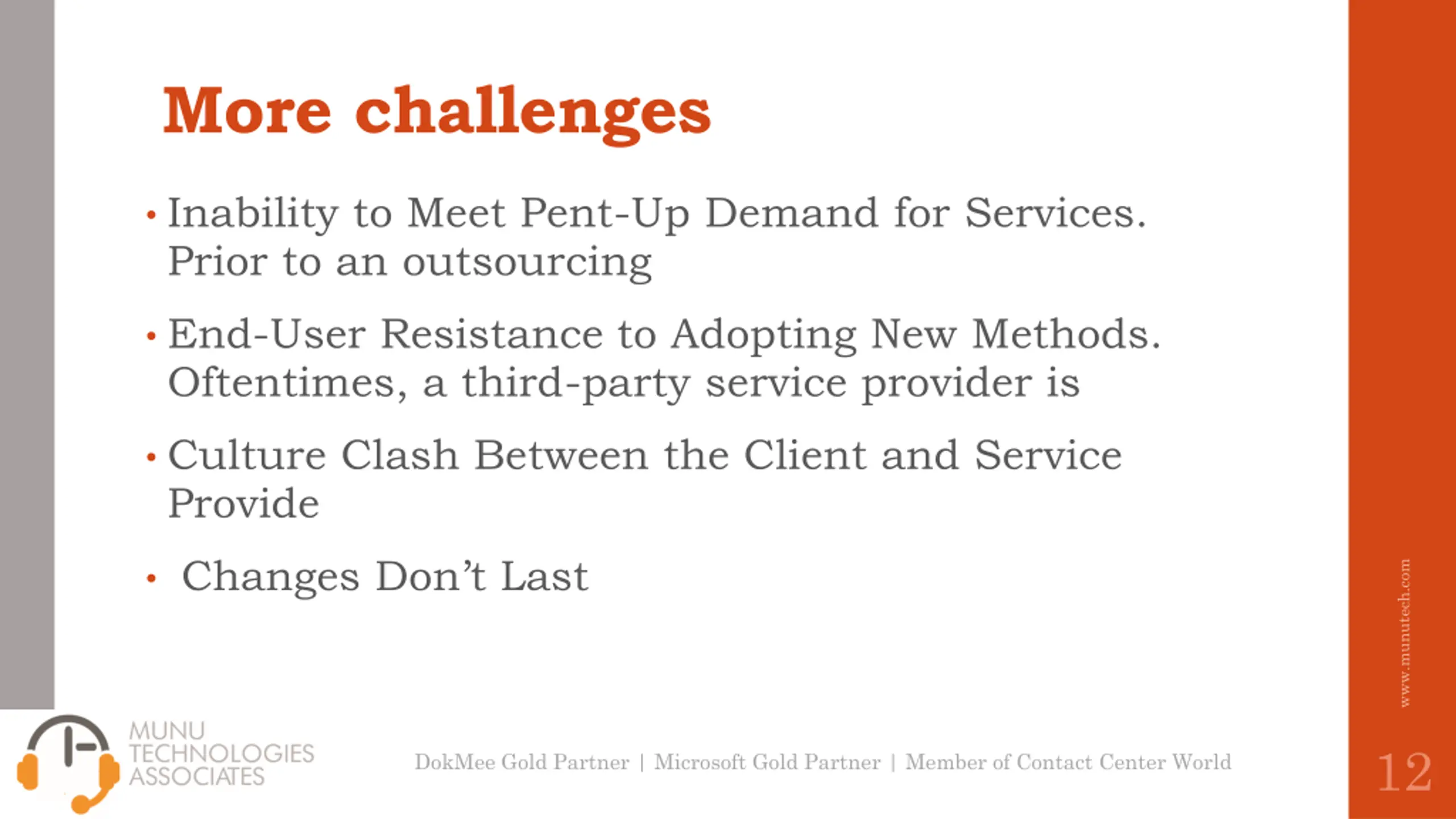 More challenges Inability to Meet Pent-Up Demand for Services. Prior to an outsourcing End-User Resistance to Adopting New Methods. Oftentimes, a third-party service provider is Culture Clash Between the Client and Service Provide Changes Don t Last www.munutech.com 12 DokMee Gold Partner | Microsoft Gold Partner | Member of Contact Center World