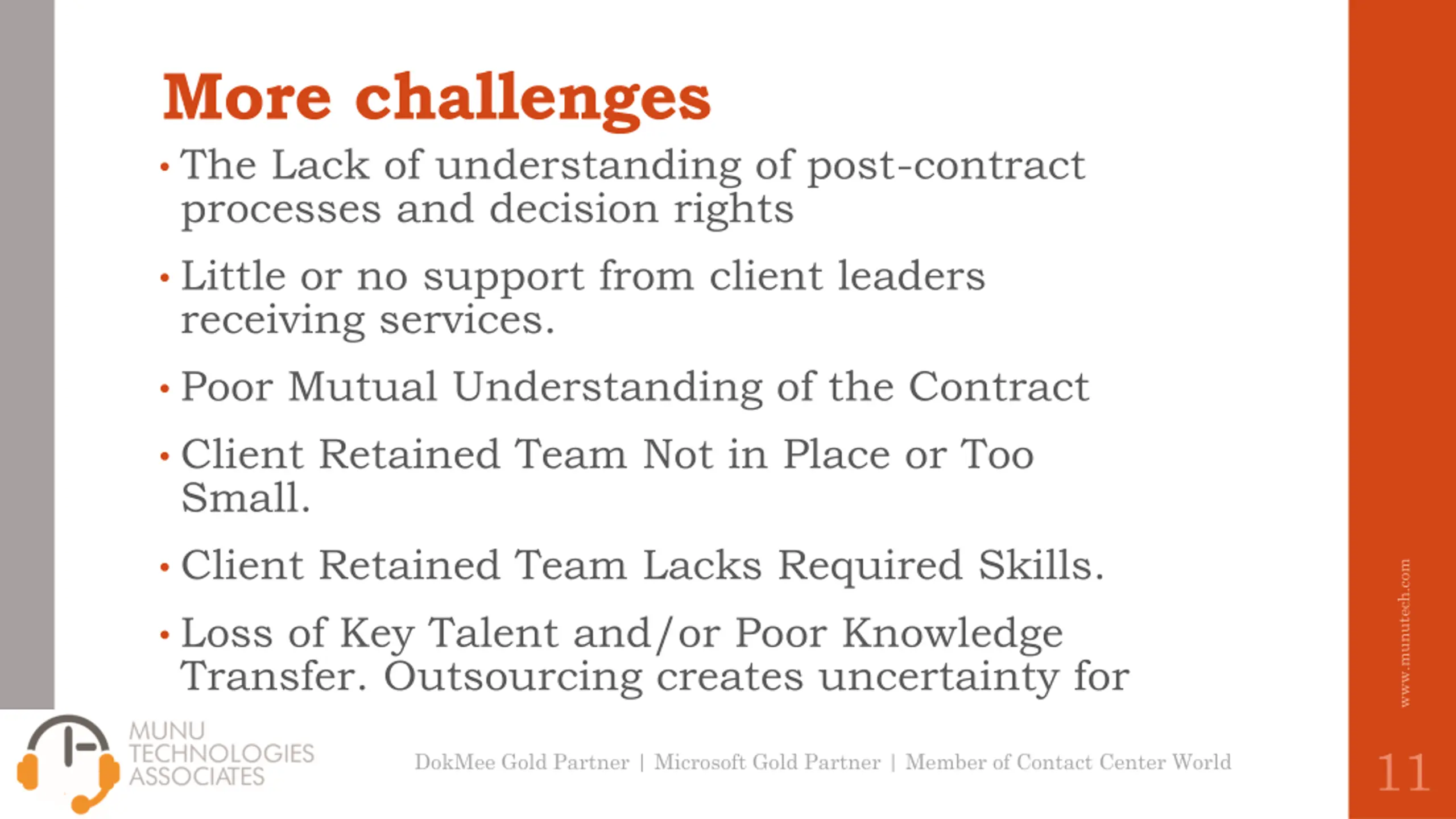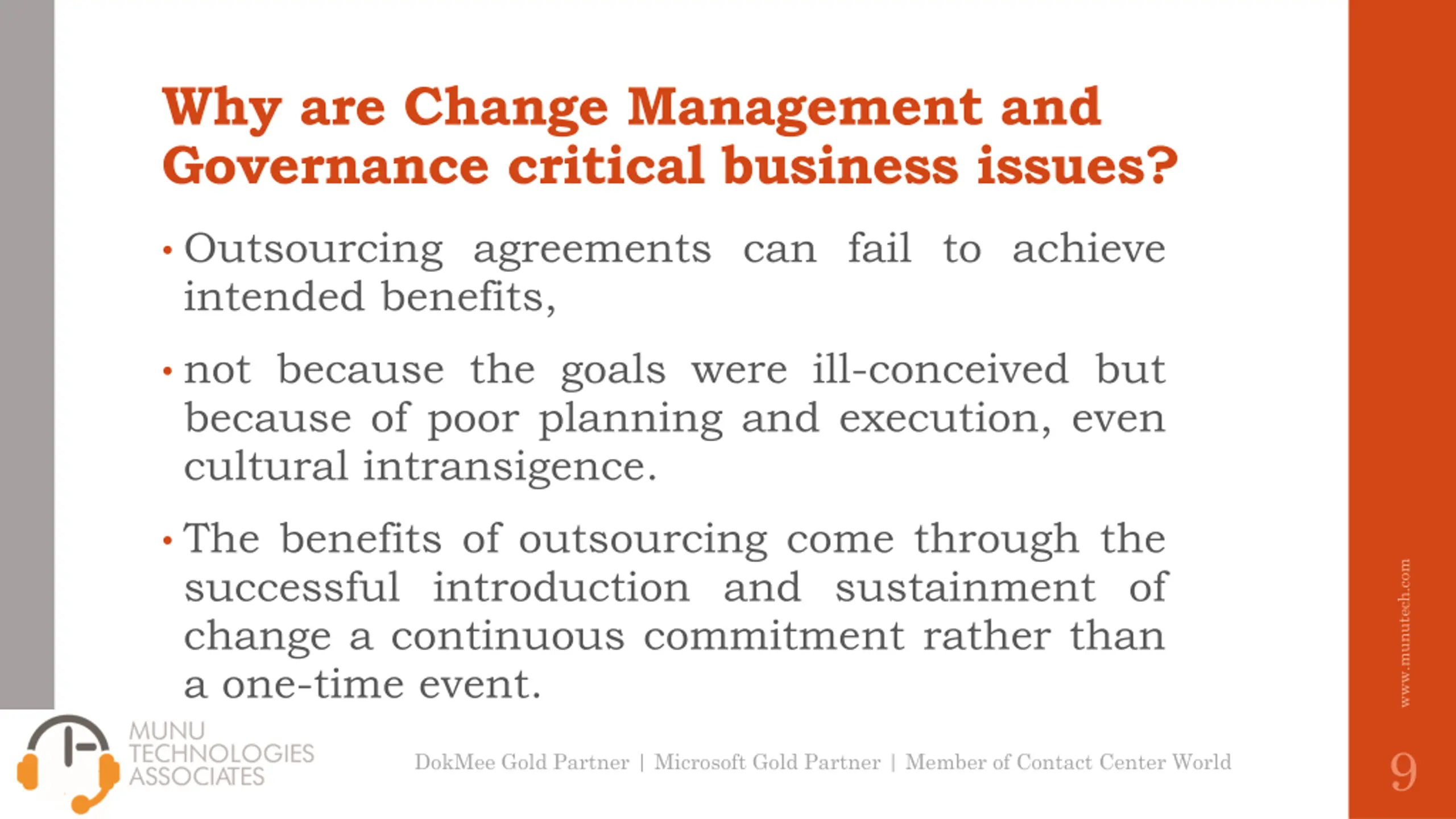 Why are Change Management and Governance critical business issues? Outsourcing agreements can fail to achieve intended benefits, not because the goals were ill-conceived but because of poor planning and execution, even cultural intransigence. The benefits of outsourcing come through the successful introduction and sustainment of change a continuous commitment rather than a one-time event. www.munutech.com 9 DokMee Gold Partner | Microsoft Gold Partner | Member of Contact Center World