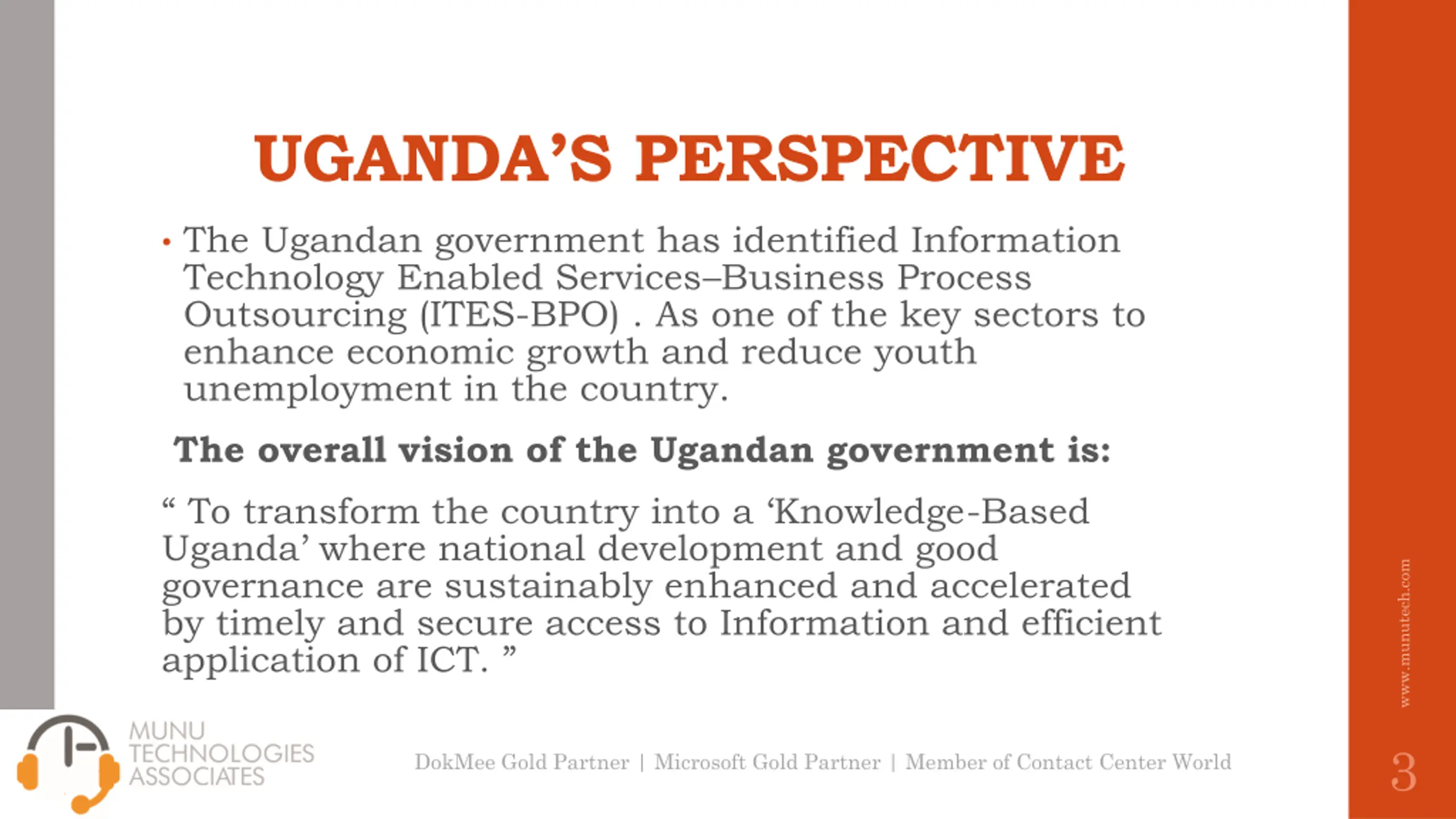 UGANDAS PERSPECTIVE The Ugandan government has identified Information Technology Enabled Services Business Process Outsourcing (ITES-BPO) . As one of the key sectors to enhance economic growth and reduce youth unemployment in the country. The overall vision of the Ugandan government is: To transform the country into a Knowledge-Based Uganda where national development and good governance are sustainably enhanced and accelerated by timely and secure access to Information and efficient application of ICT. www.munutech.com 3 DokMee Gold Partner | Microsoft Gold Partner | Member of Contact Center World