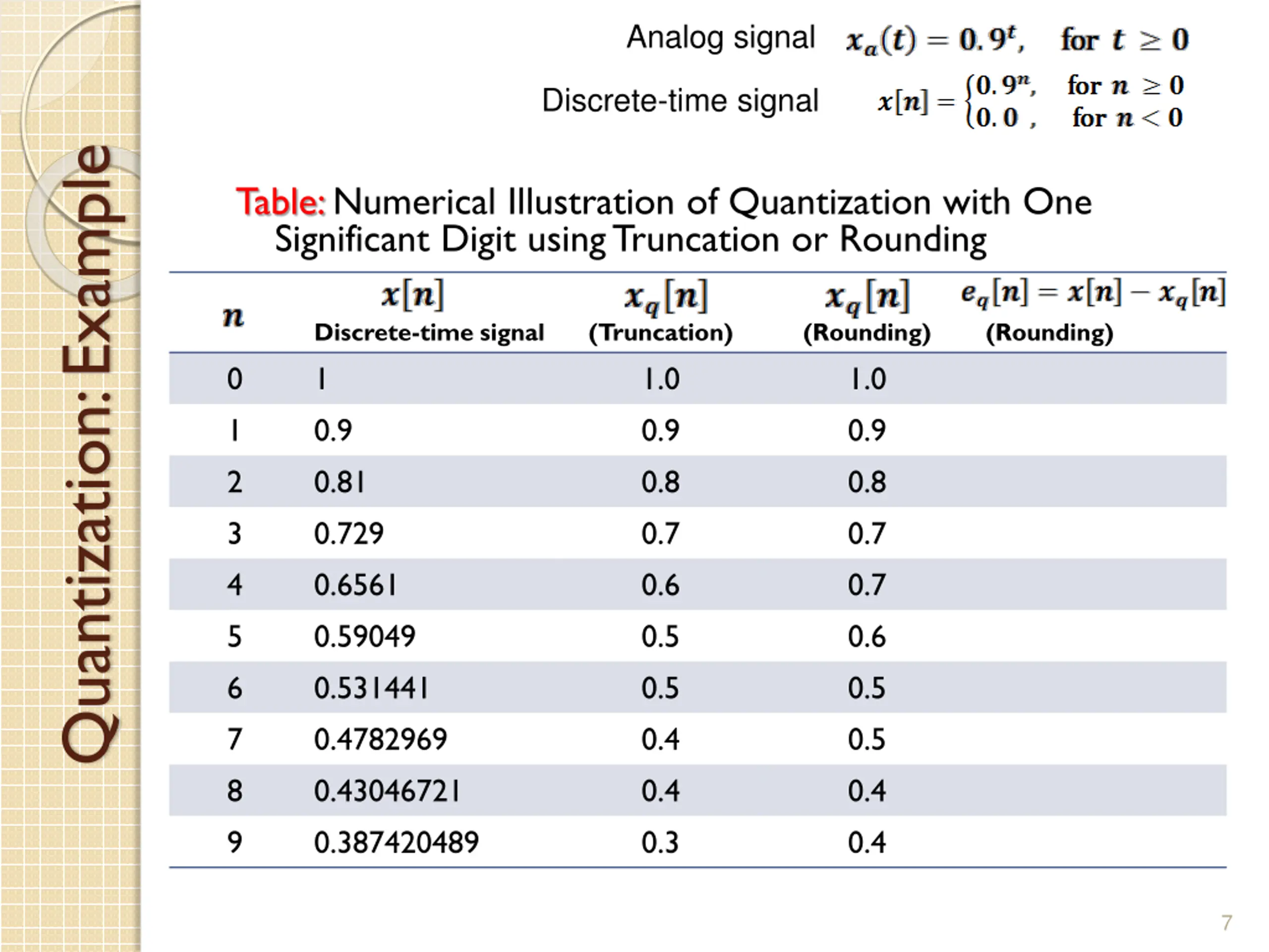 Analog signal Discrete-time signal Quantization: Example Table: Numerical Illustration of Quantization with One Significant Digit using Truncation or Rounding Discrete-time signal 1 0.9 0.81 0.729 0.6561 0.59049 0.531441 0.4782969 0.43046721 0.387420489 (Truncation) 1.0 0.9 0.8 0.7 0.6 0.5 0.5 0.4 0.4 0.3 (Rounding) 1.0 0.9 0.8 0.7 0.7 0.6 0.5 0.5 0.4 0.4 (Rounding) 0.0 0.0 -0.01 -0.029 0.0439 0.00951 -0.031441 0.0217031 -0.03046721 0.012579511 0 1 2 3 4 5 6 7 8 9 9