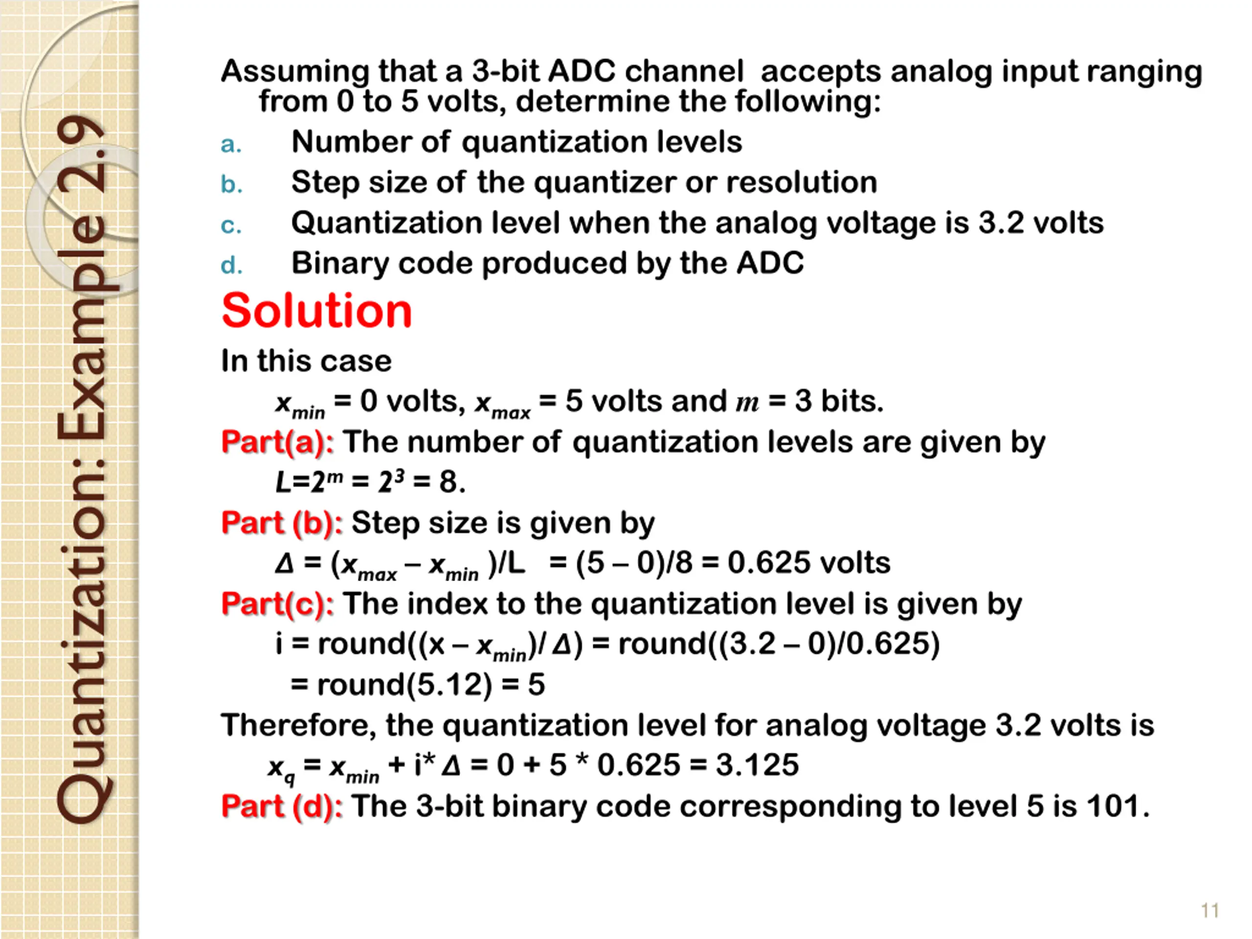 Given an analog signal x(t) and the number of bits m in an ADC Quantization: How it done? Find out the number of quantization levels: L=2m Find out the step size of the quantizer: = (xmax xmin)/L The index corresponding to the binary code is: i = round(x xmin)/ Values of the quantization levels: xq = xmin + i , where i=0,1,2, ,L 10