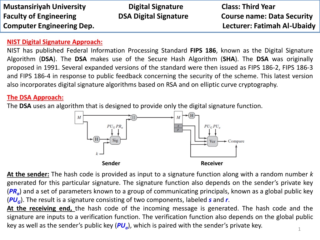 Mustansiriyah University Faculty of Engineering DSA Digital Signature Course name: Data Security Computer Engineering Dep. Lecturer: Fatimah Al-Ubaidy Digital Signature Class: Third Year NIST Digital Signature Approach: NIST has published Federal Information Processing Standard FIPS186, known as the Digital Signature Algorithm (DSA). The DSA makes use of the Secure Hash Algorithm (SHA). The DSA was originally proposed in 1991. Several expanded versions of the standard were then issued as FIPS 186-2, FIPS 186-3 and FIPS 186-4 in response to public feedback concerning the security of the scheme. This latest version also incorporates digital signature algorithms based on RSA and on elliptic curve cryptography. The DSA Approach: The DSA uses an algorithm that is designed to provide only the digital signature function. Sender Receiver At the sender: The hash code is provided as input to a signature function along with a random number k generated for this particular signature. The signature function also depends on the sender s private key (PRa) and a set of parameters known to a group of communicating principals, known as a global public key (PUG). The result is a signature consisting of two components, labeled sand r. At the receiving end, the hash code of the incoming message is generated. The hash code and the signature are inputs to a verification function. The verification function also depends on the global public key as well as the sender s public key (PUa), which is paired with the sender s private key. 1