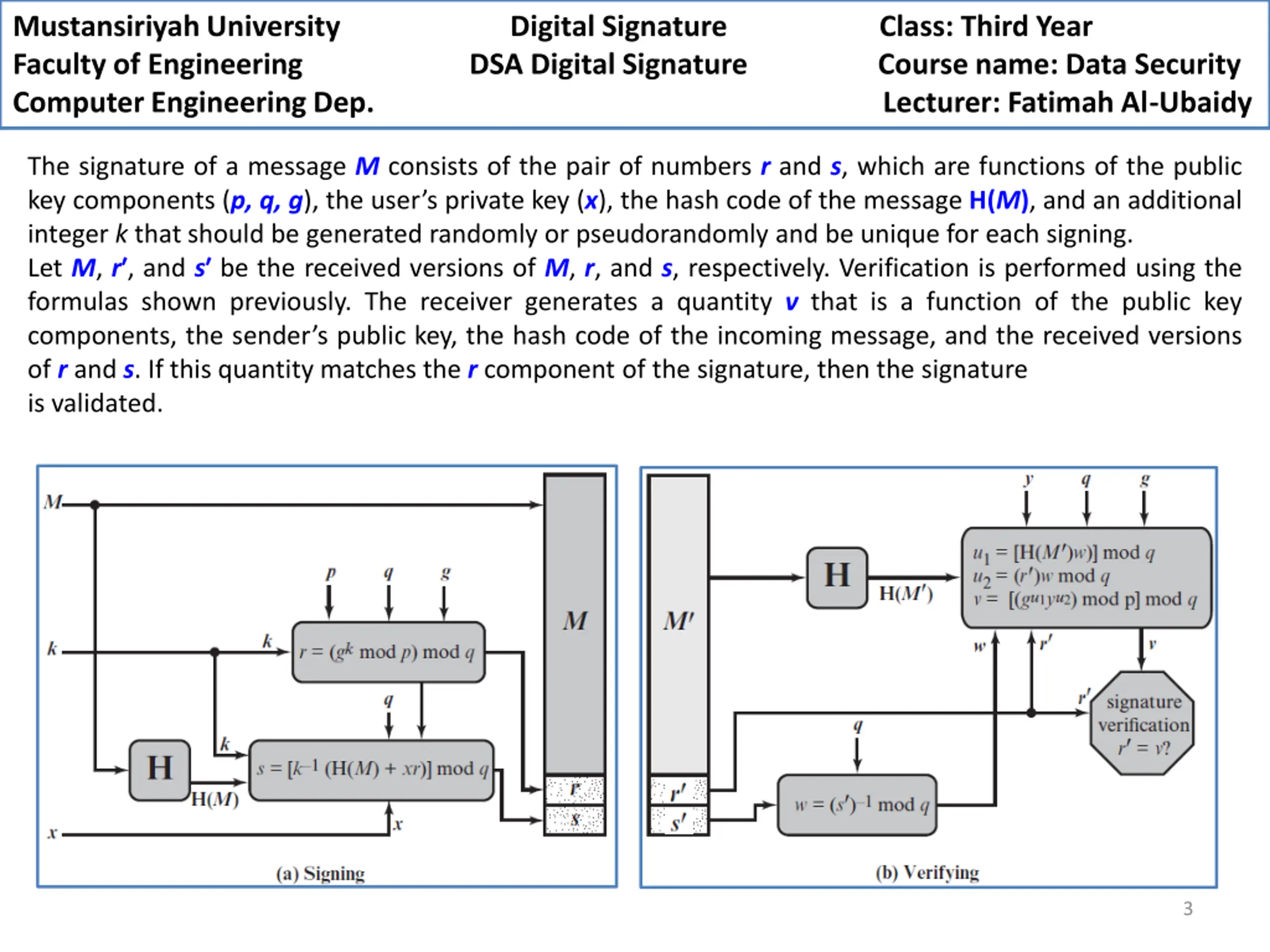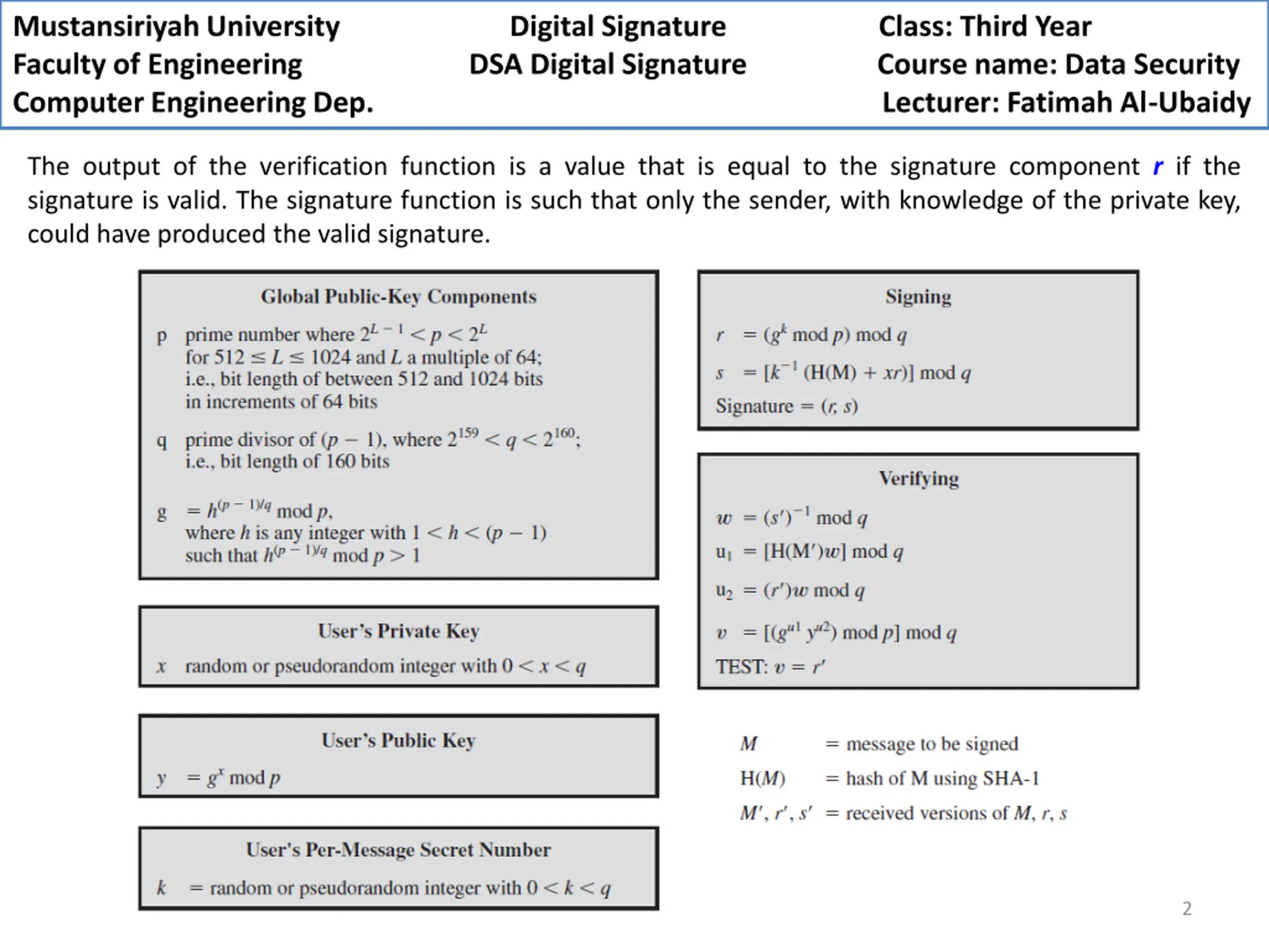 Mustansiriyah University Faculty of Engineering DSA Digital Signature Course name: Data Security Computer Engineering Dep. Lecturer: Fatimah Al-Ubaidy Digital Signature Class: Third Year The output of the verification function is a value that is equal to the signature component rif the signature is valid. The signature function is such that only the sender, with knowledge of the private key, could have produced the valid signature. 2
