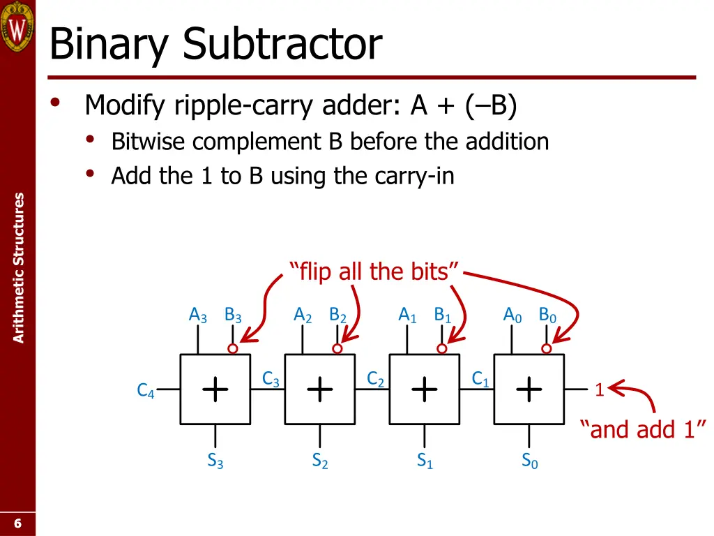 Adder/Subtractor Use the same structure to both add and subtract Conditionally negate the second operand If we want to add, don t negate If we want to subtract, negate: Flip all the bits and add 1 Arithmetic Structures Augment the structure with additional logic and a special control signal Control input to the adder/subtractor chooses the mode of operation Depending on its value, the structure adds or subtracts 7 7 7
