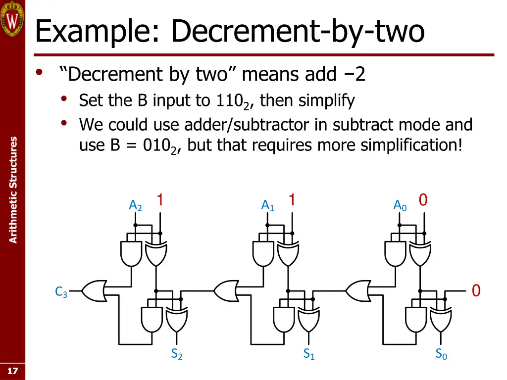 Example: Incrementer Note: if an amount is not specified, should assume increment means add 1 Simplified adder structure Set the B input to 0012, then simplify Arithmetic Structures 0 0 1 A2 B2 A1 B1 A0 B0 C0 0 C3 S2 S1 S0 12 12 12