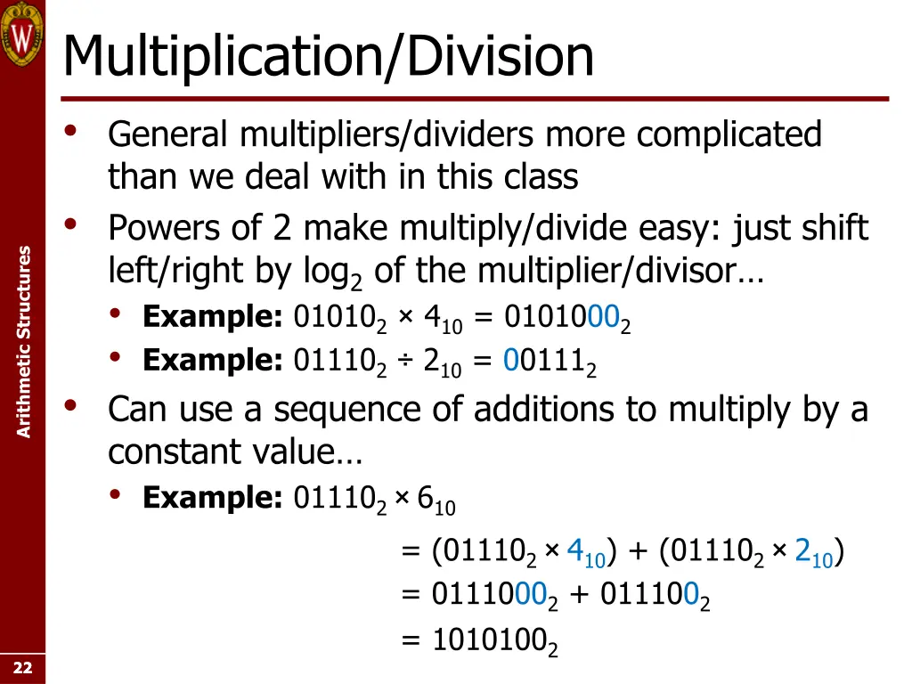Multiplication/Division General multipliers/dividers more complicated than we deal with in this class Powers of 2 make multiply/divide easy: just shift left/right by log2of the multiplier/divisor Example: 010102 410 = 01010002 Example: 011102 210 = 001112 Can use a sequence of additions to multiply by a constant value Example: 011102 610 = (011102 410) + (011102 210) Arithmetic Structures = 01110002 + 0111002 = 10101002 22 22 22